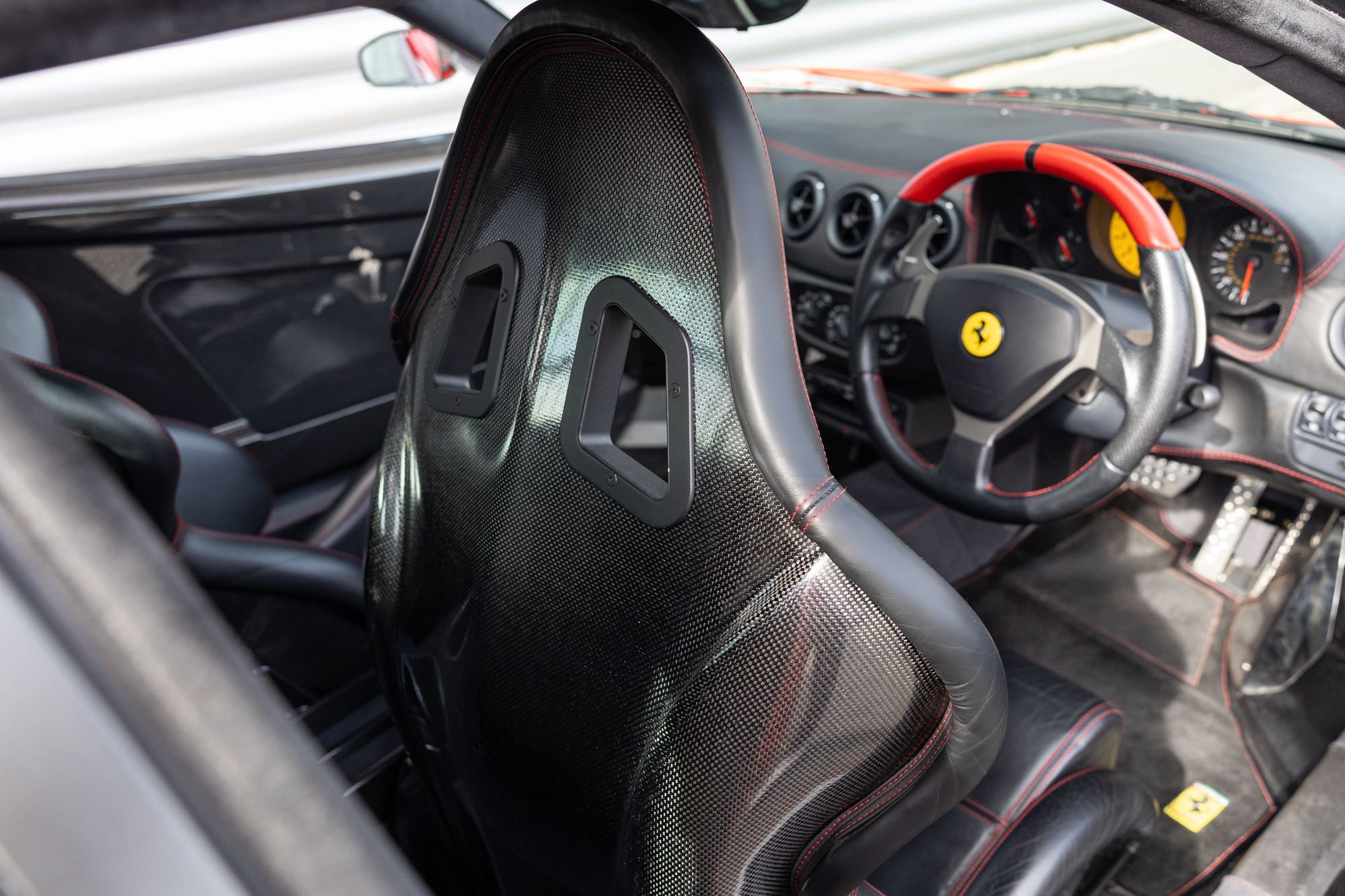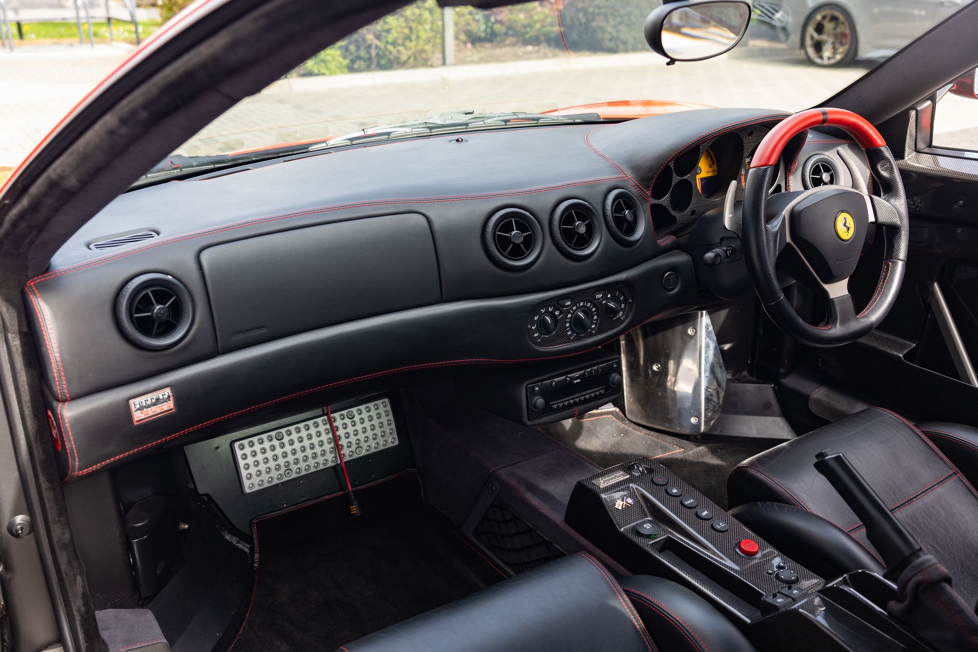 Compared with a regular 360 Modena, weight was reduced by up to 100kg via the use of Alcantara upholstery, lightened bumpers, carbon mirrors, Modena carbon seats and a lack of radio or sound deadening. The engine and transmission were lightened through the use of a smaller sports exhaust back box and valved exit pipes.