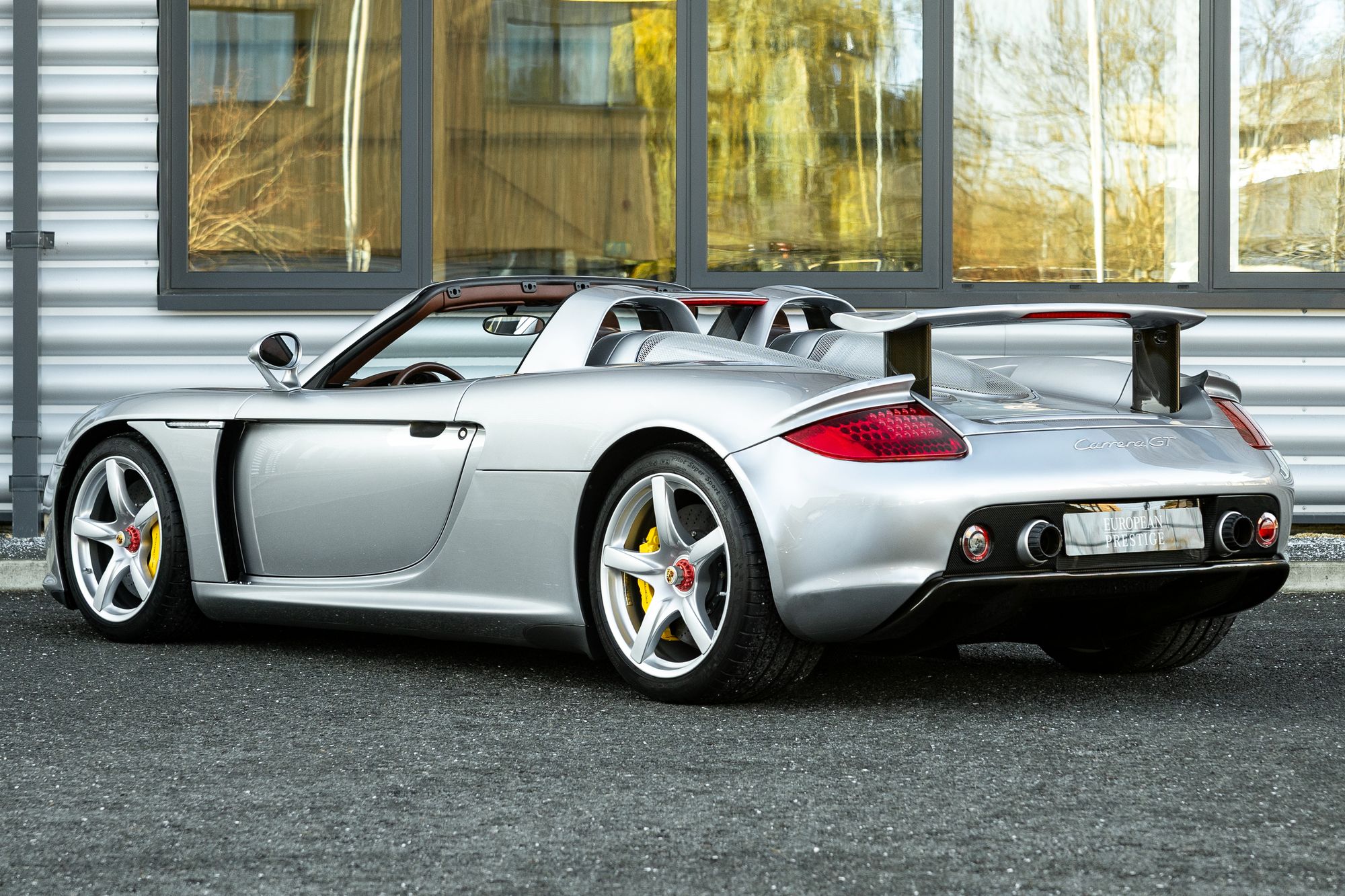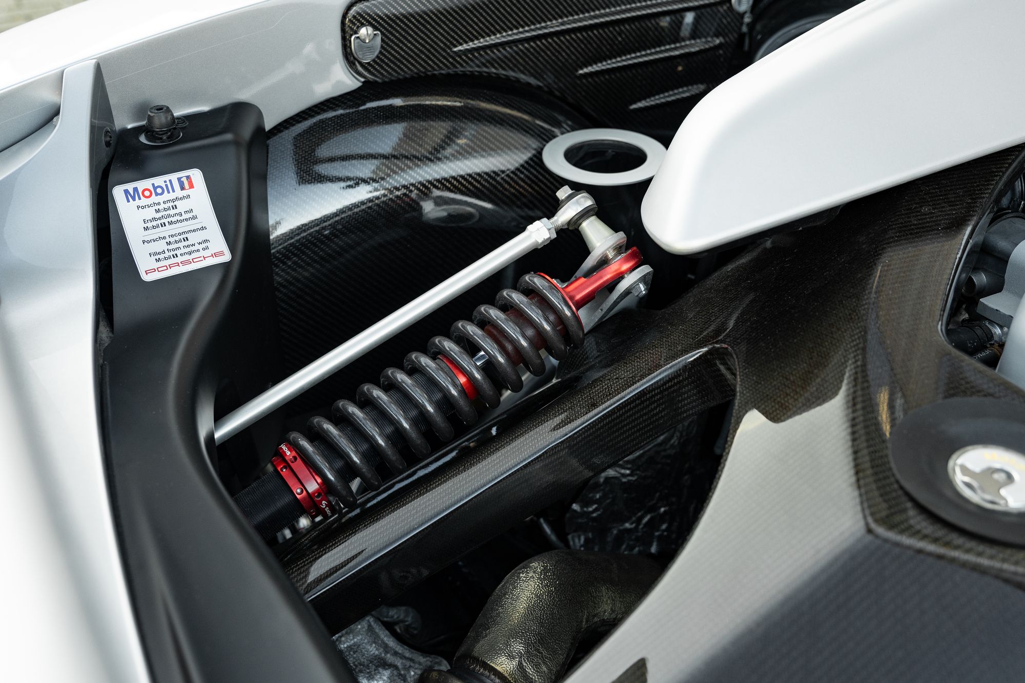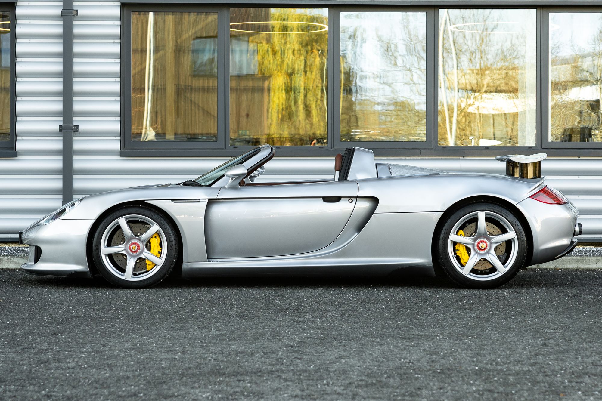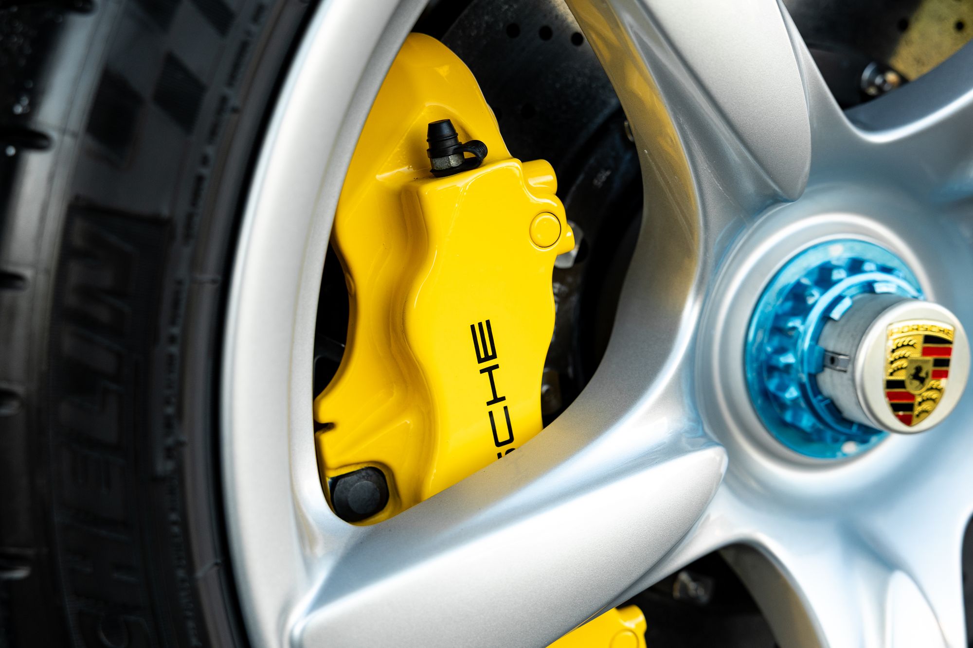 The Carrera GT has large side inlets and air dams to cool the V10 under the carbon fibre rear bonnet, as well as carbon fibre-reinforced Silicon Carbide (C/SiC) ceramic composite brakes, inboard suspension with pushrod actuated shock absorbers and dampers, and staggered 19-inch front and 20-inch rear five-spoke alloy wheels.