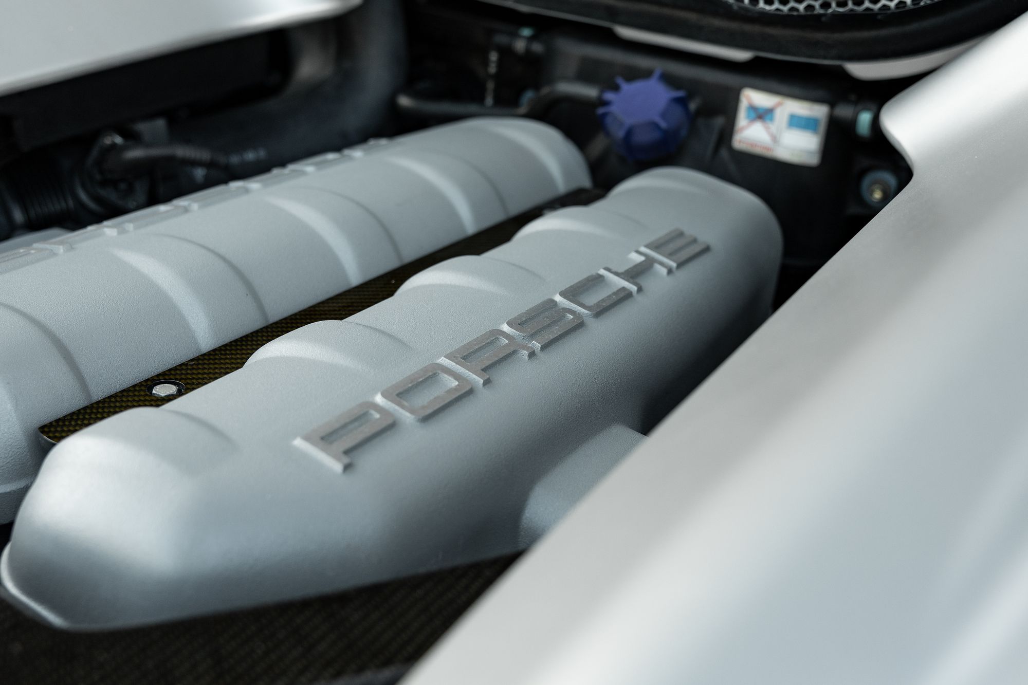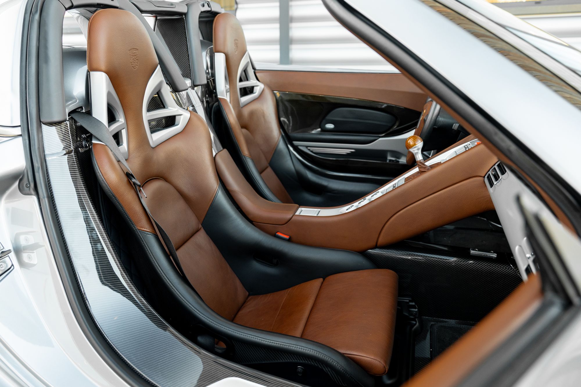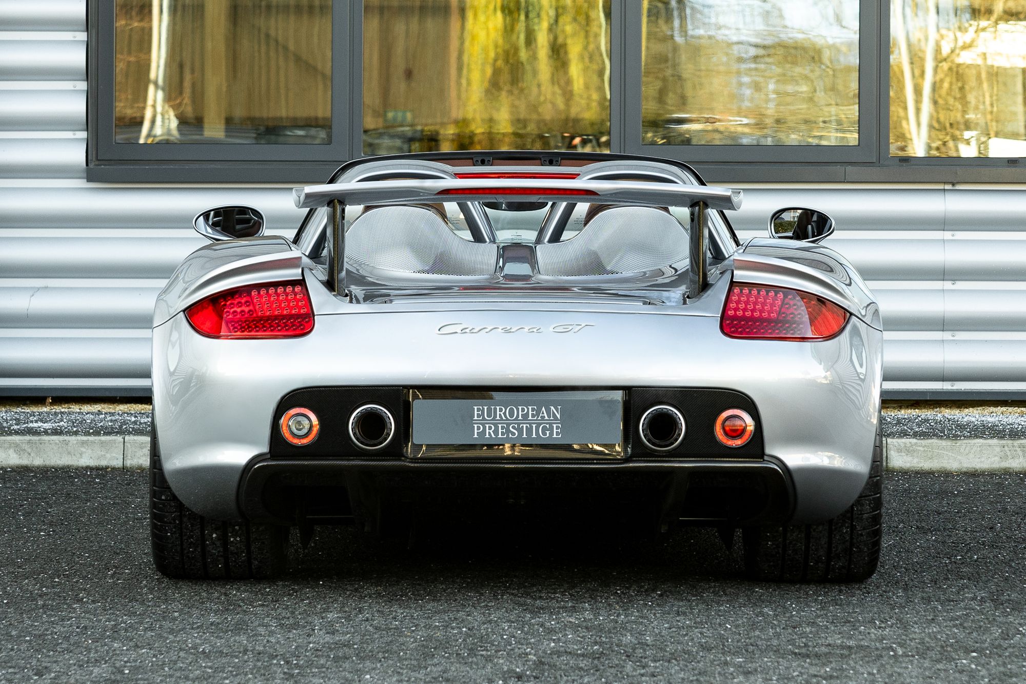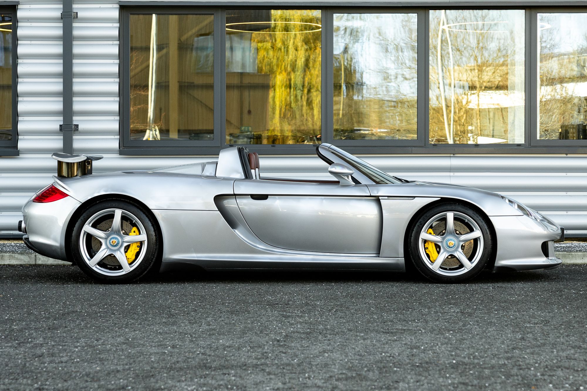 The Carrera GT has large side inlets and air dams to cool the V10 under the carbon fibre rear bonnet, as well as carbon fibre-reinforced Silicon Carbide (C/SiC) ceramic composite brakes, inboard suspension with pushrod actuated shock absorbers and dampers, and staggered 19-inch front and 20-inch rear five-spoke alloy wheels.