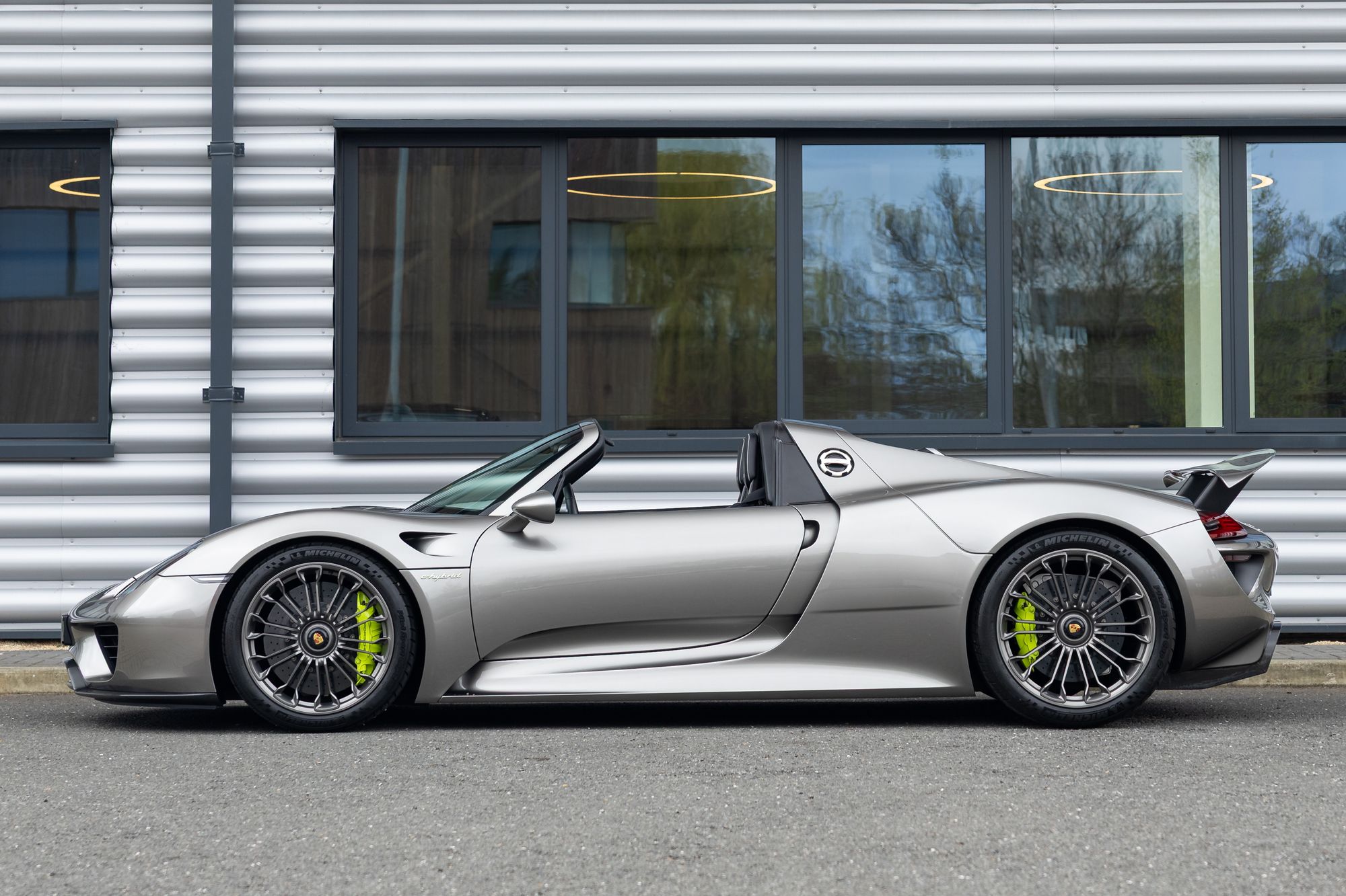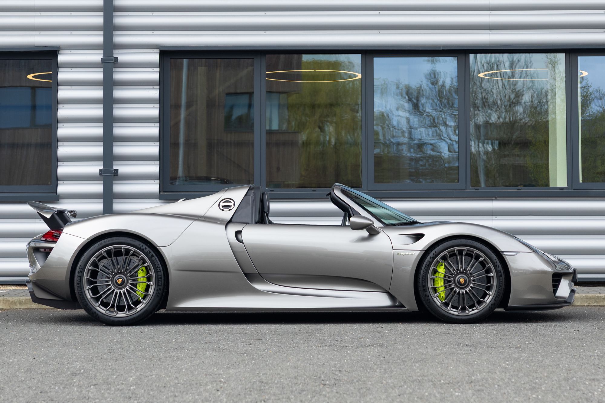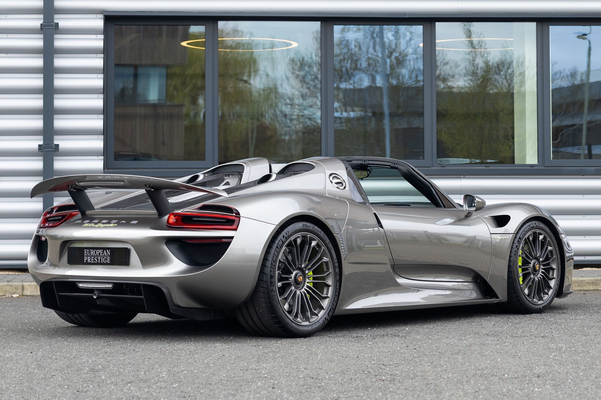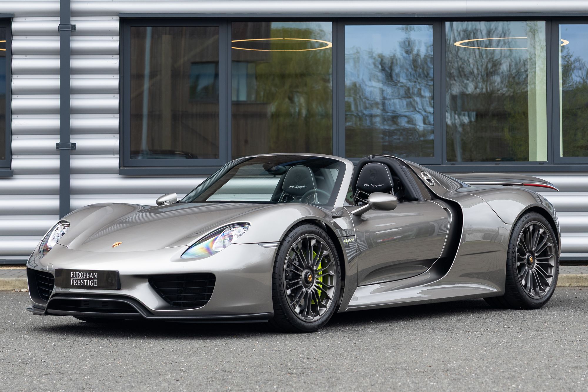 The Porsche 918 Spyder is a limited-production plug-in hybrid sports car, of which only 918 examples were built. It is powered by a mid-mounted naturally aspirated 4.6-litre V8 derived from the RS Spyder Le Mans Prototype, developing 599hp and 398lb ft of torque, with two electric motors delivering an additional 282hp. One 154hp electric motor drives the rear wheels in parallel with the engine and also serves as the main generator, delivering power to the rear axle via a seven-speed PDK gearbox, while the front 127hp electric motor directly drives the front axle, and an electric clutch decouples the motor when not in use. The system delivers 875hp and 944 lb-ft of torque in total, resulting in a claimed 0-62mph sprint time of just 2.6 seconds, and a top speed of 214mph. Independent media tests found it was even quicker, with Car and Driver magazine recording a 0-60mph time of just 2.2 seconds.