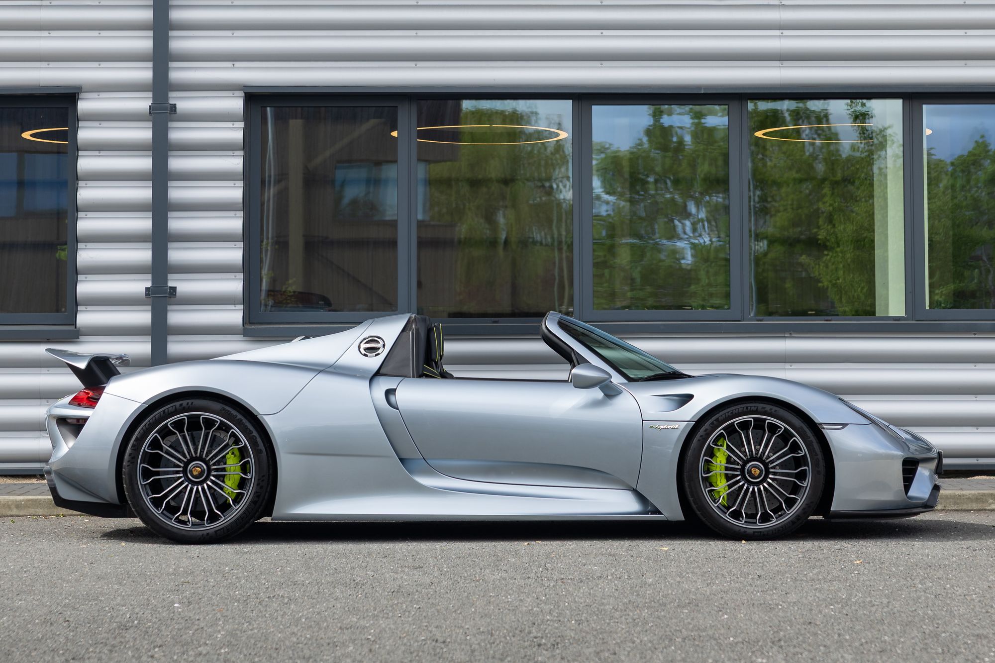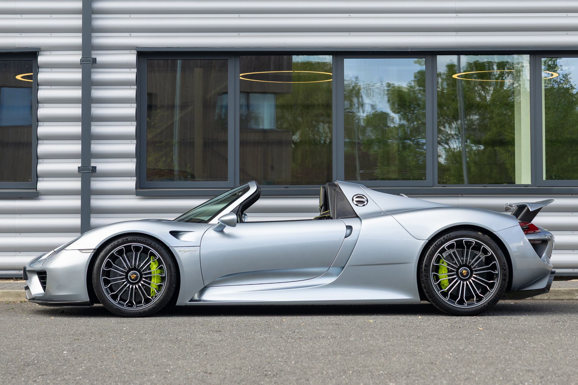 The Porsche 918 Spyder is a limited-production plug-in hybrid sports car, of which only 918 examples were built. It is powered by a mid-mounted naturally aspirated 4.6-litre V8 derived from the RS Spyder Le Mans Prototype, developing 599hp and 398lb ft of torque, with two electric motors delivering an additional 282hp. One 154hp electric motor drives the rear wheels in parallel with the engine and also serves as the main generator, delivering power to the rear axle via a seven-speed PDK gearbox, while the front 127hp electric motor directly drives the front axle, and an electric clutch decouples the motor when not in use. The system