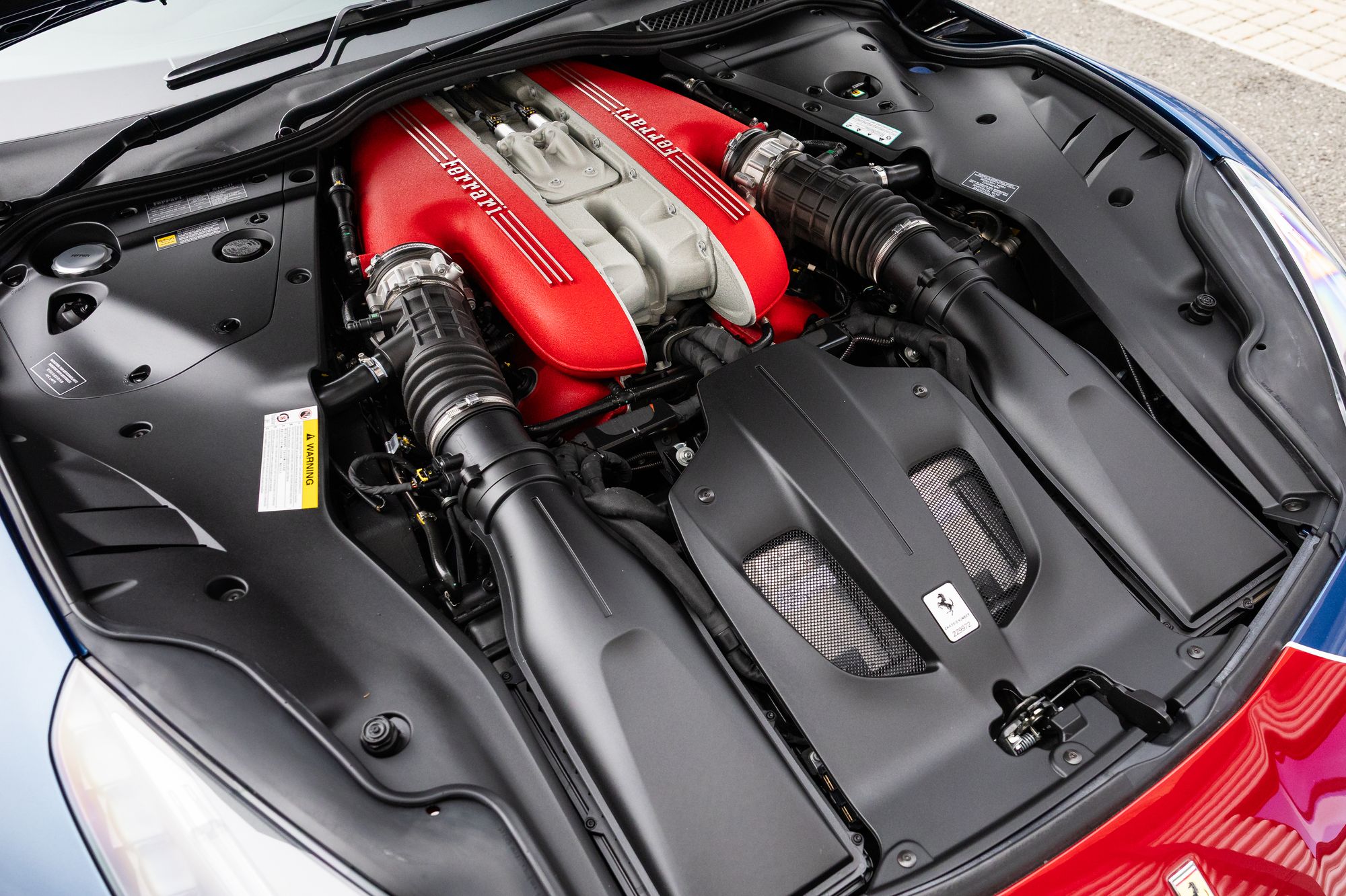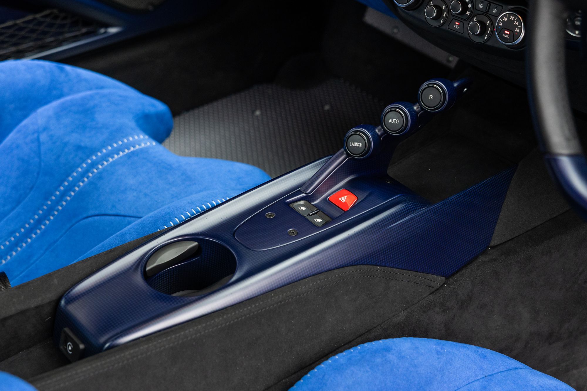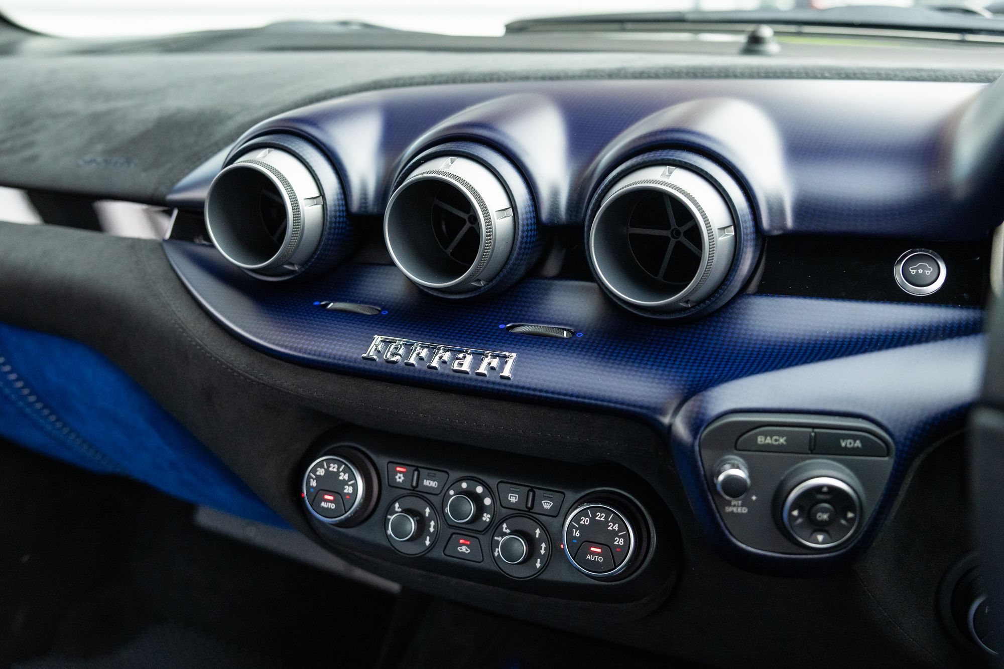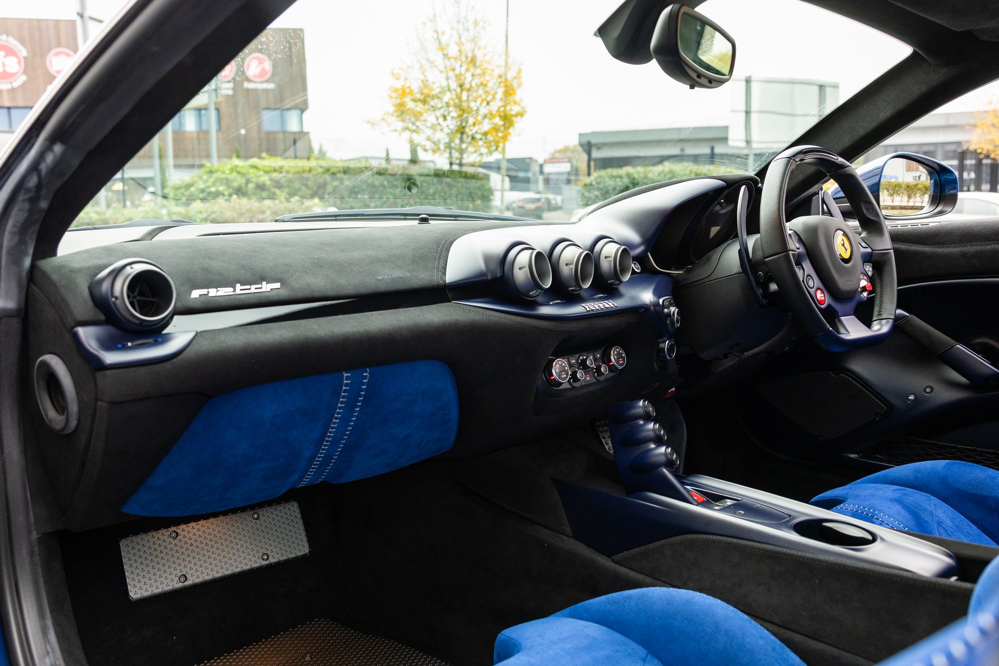 The TDF shares the Berlinetta’s 6.3-litre V12, but with power output increased to 769 hp at 8,500 rpm and 520 lb ft of torque at 6,750 rpm. It is also 110 kg lighter than the Berlinetta, having a claimed dry weight of 1,415 kg and a kerb weight of 1,520 kg. The result is a 0-62mph acceleration time of 2.9 seconds, and a claimed top speed of 211 mph. The car has recorded a 1-minute 21-second lap time on Ferrari's Fiorano test circuit, which was two seconds faster than the standard F12 Berlinetta and 488 GTB, and just 1.3 seconds behind the fastest lap set by the LaFerrari.