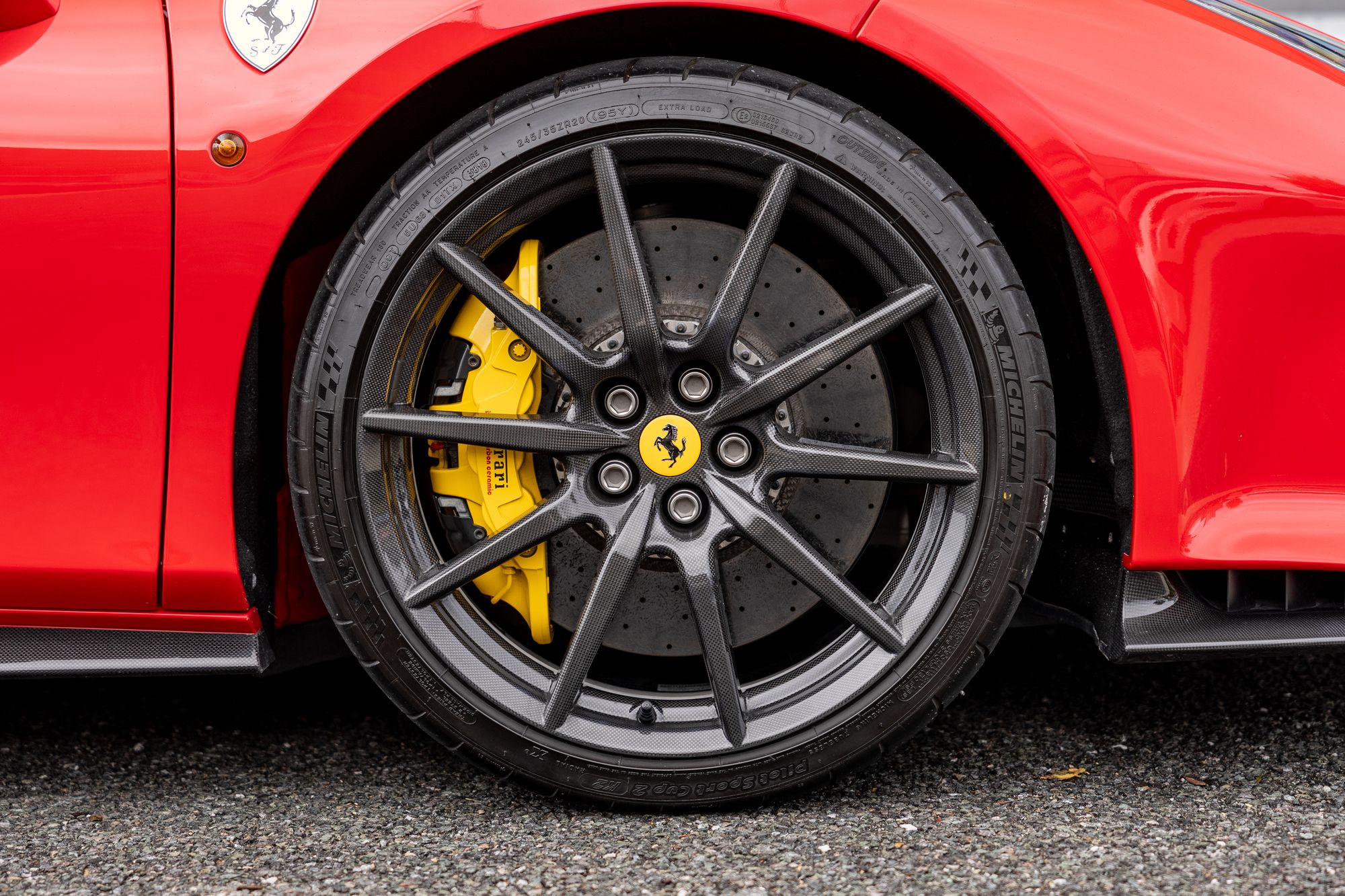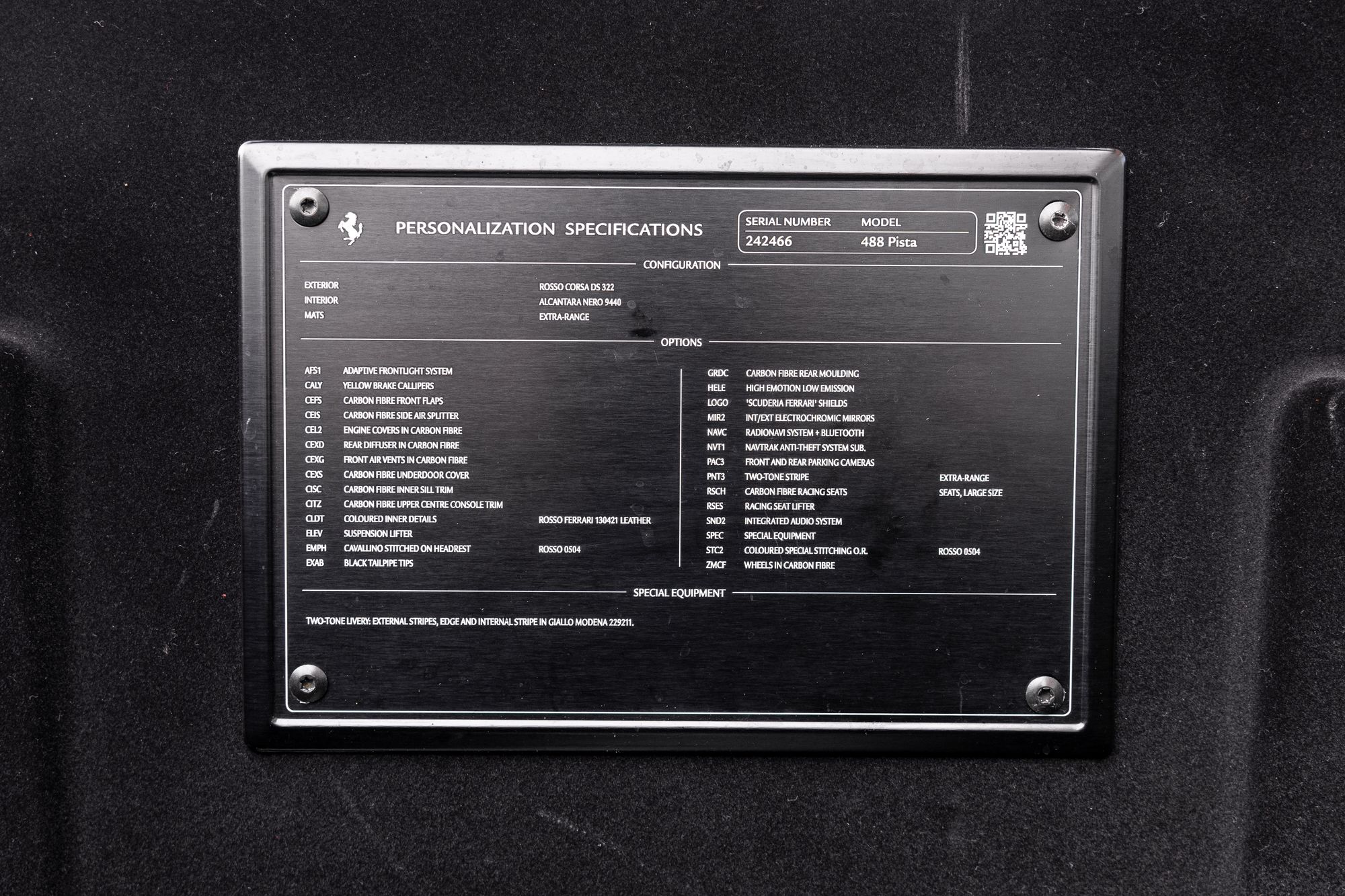 Key Points: Paint Protection Film (PPF), 20" Carbon Fibre Wheels, Two-Tone Livery: External Stripes, Edge and Internal Stripe in Giallo Modena.