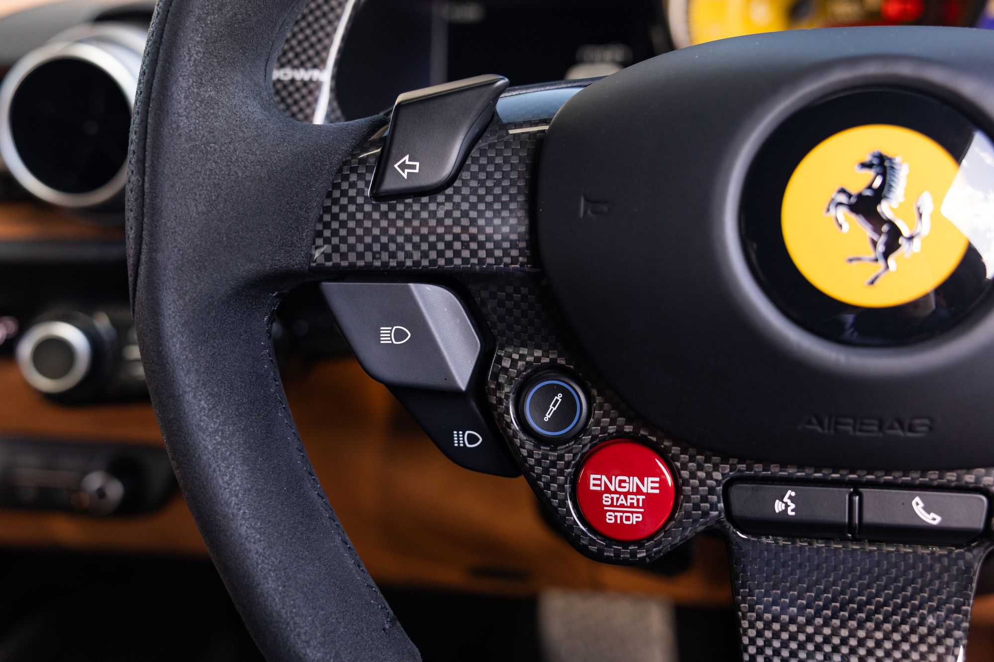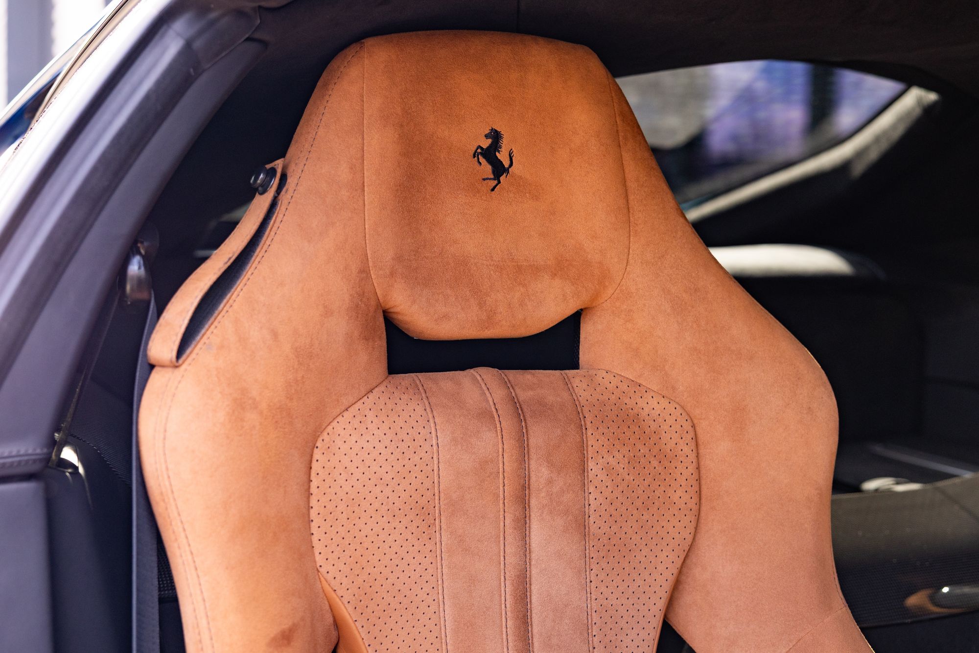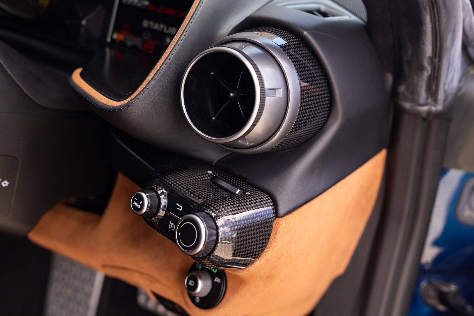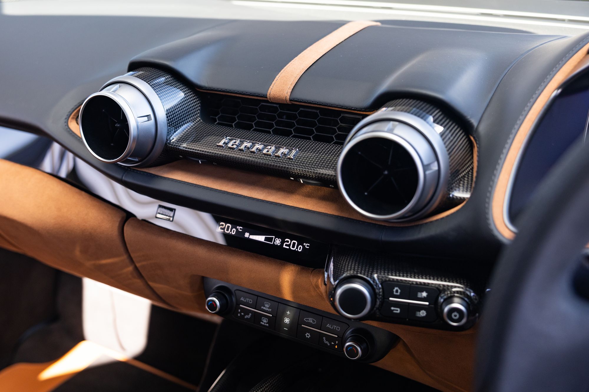 The interior of the 812 Superfast takes inspiration from both the preceding F12 Berlinetta and the interior of the LaFerrari. As part of the Ferrari's flagship model design, the centre control continues to lack a central infotainment display featured in entry-level models such as the GTC4Lusso and Portofino, retaining only a small temperature display for the climate control system and splitting all vehicular status information displays among the driver's multifunction instrument cluster, as well as the passenger-side touchscreen display.