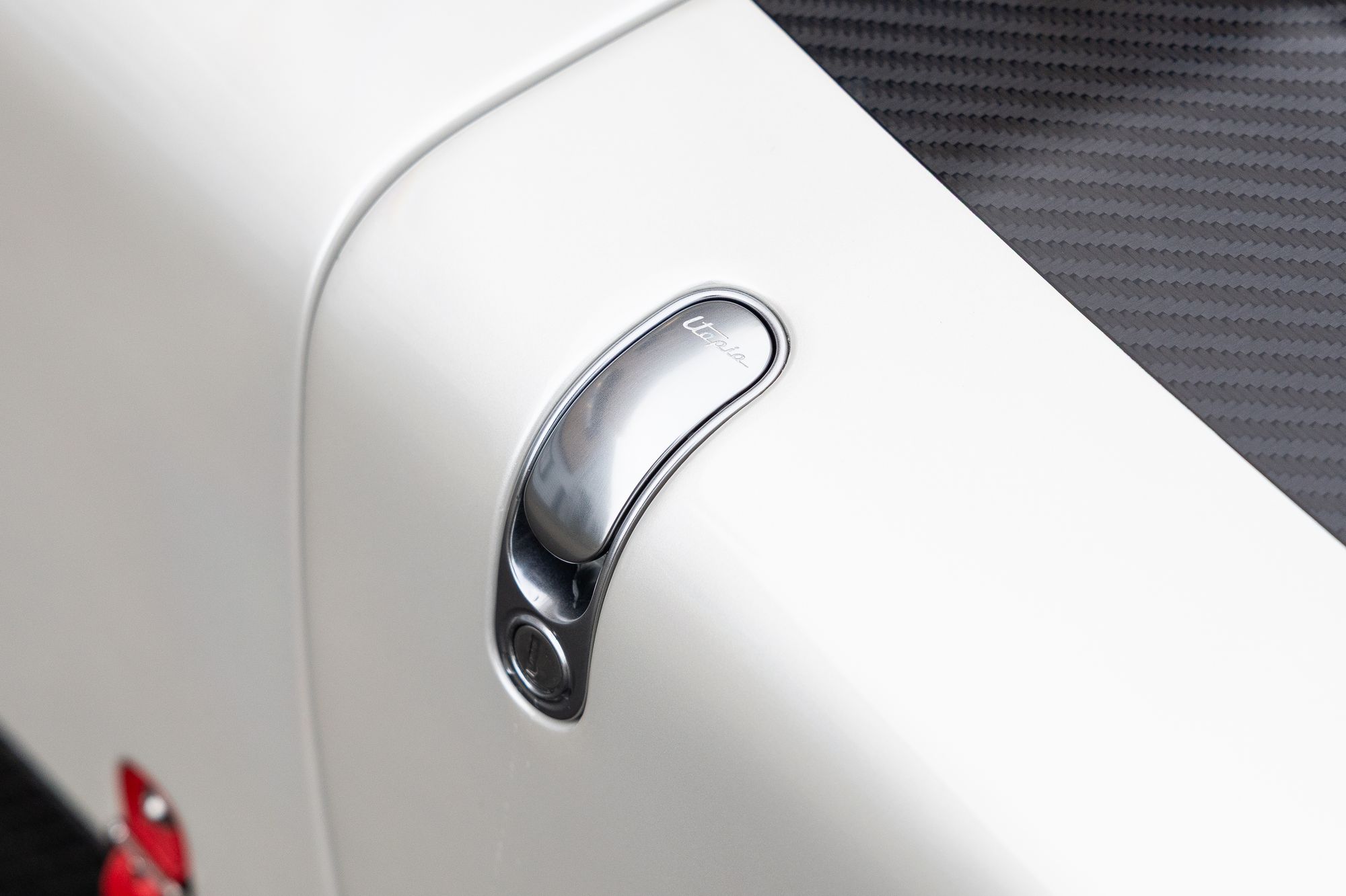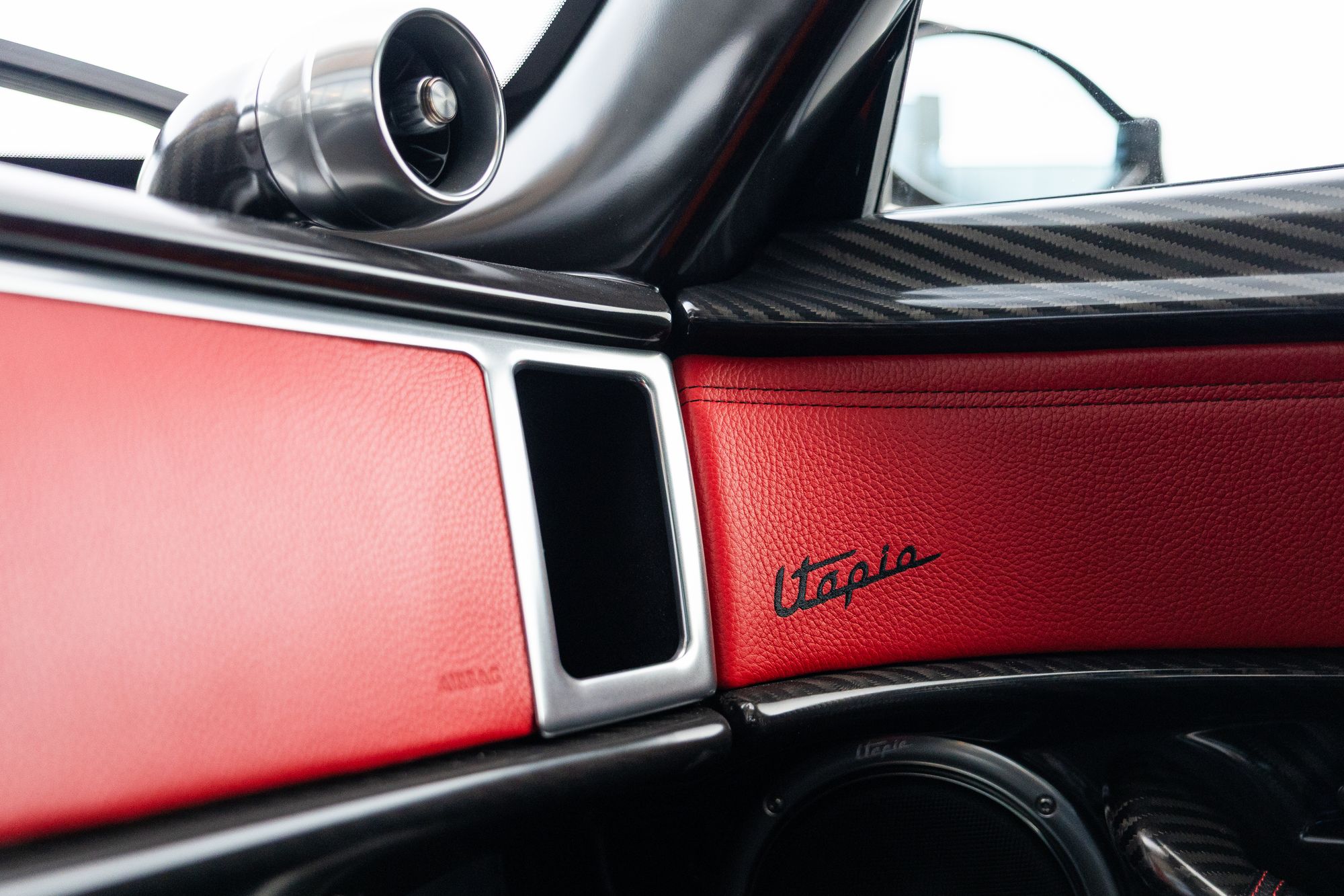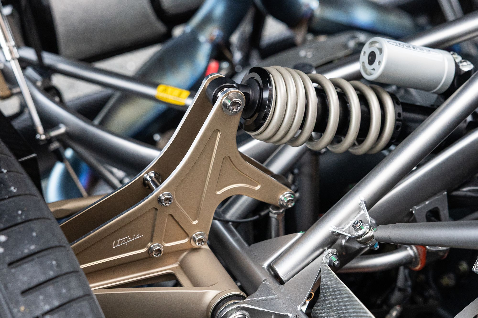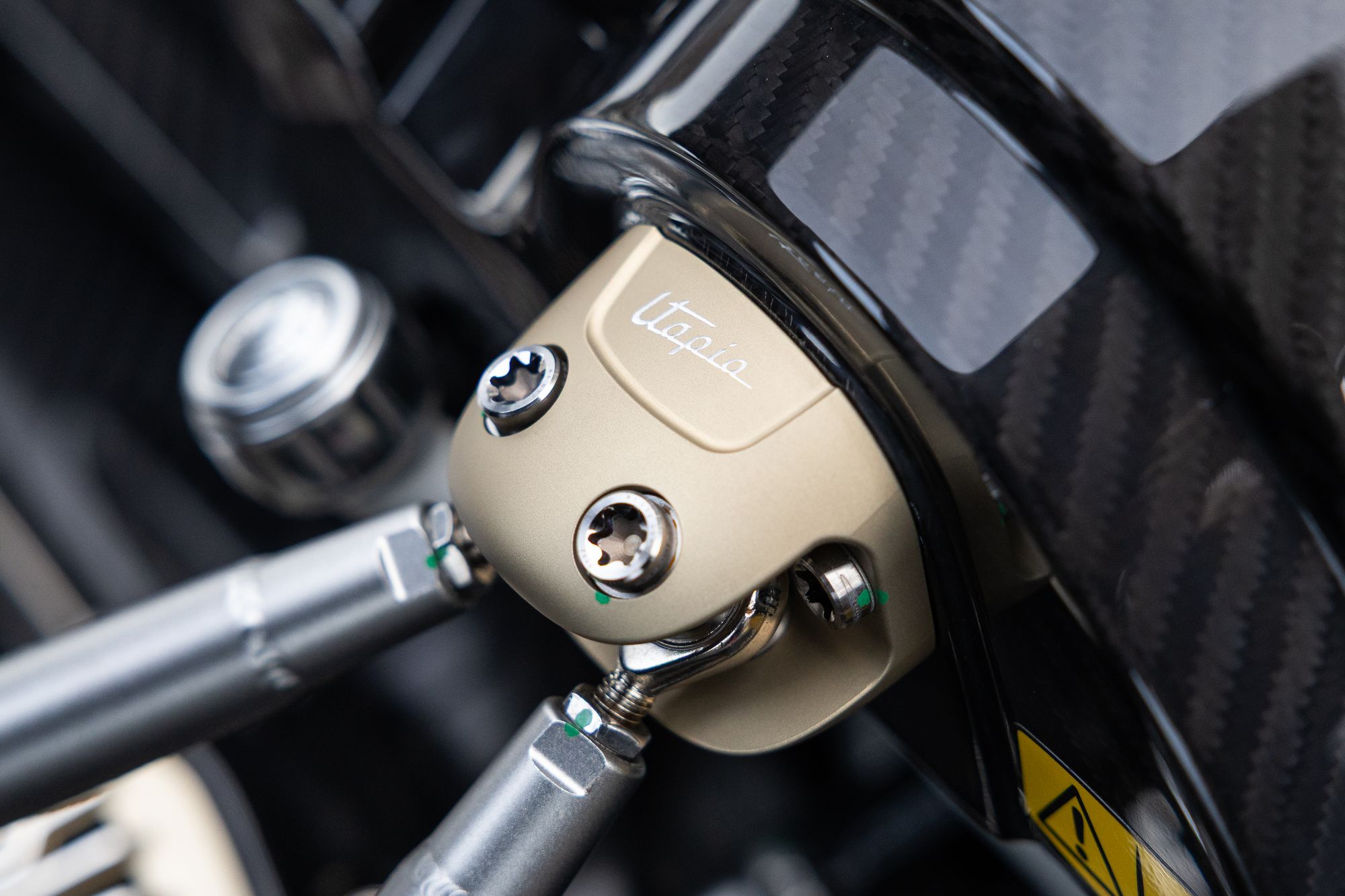 Strictly limited to 99 examples, the Utopia's design emphases aerodynamic simplicity, drawing inspiration from 1950s objects like Vespa scooter headlamps and Riva speedboats. The car features active aerodynamics combined with electronically controlled shock absorbers, as well as a titanium six-pipe exhaust system, carbon-fibre bodywork, and a set of staggered 21-inch front and 22-inch rear Monolithic Avional forged aluminum alloy wheels with turbine-shaped carbon-fibre extractors, which help to cool the Brembo carbon-ceramic brakes.