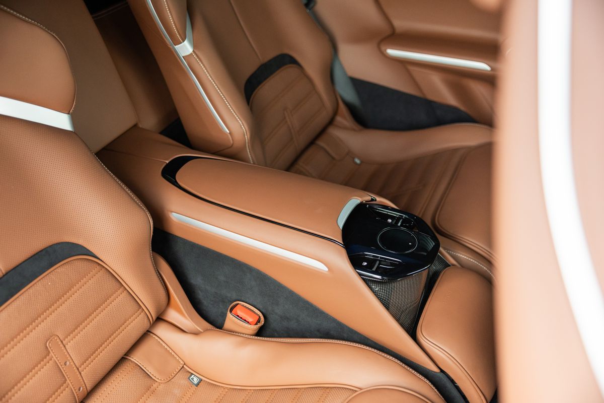 The four-seat interior has an electronically dimmable sunroof, a retractable touch dial that controls the air conditioning, a 16-inch driver’s display and a 10-inch passenger-side screen.