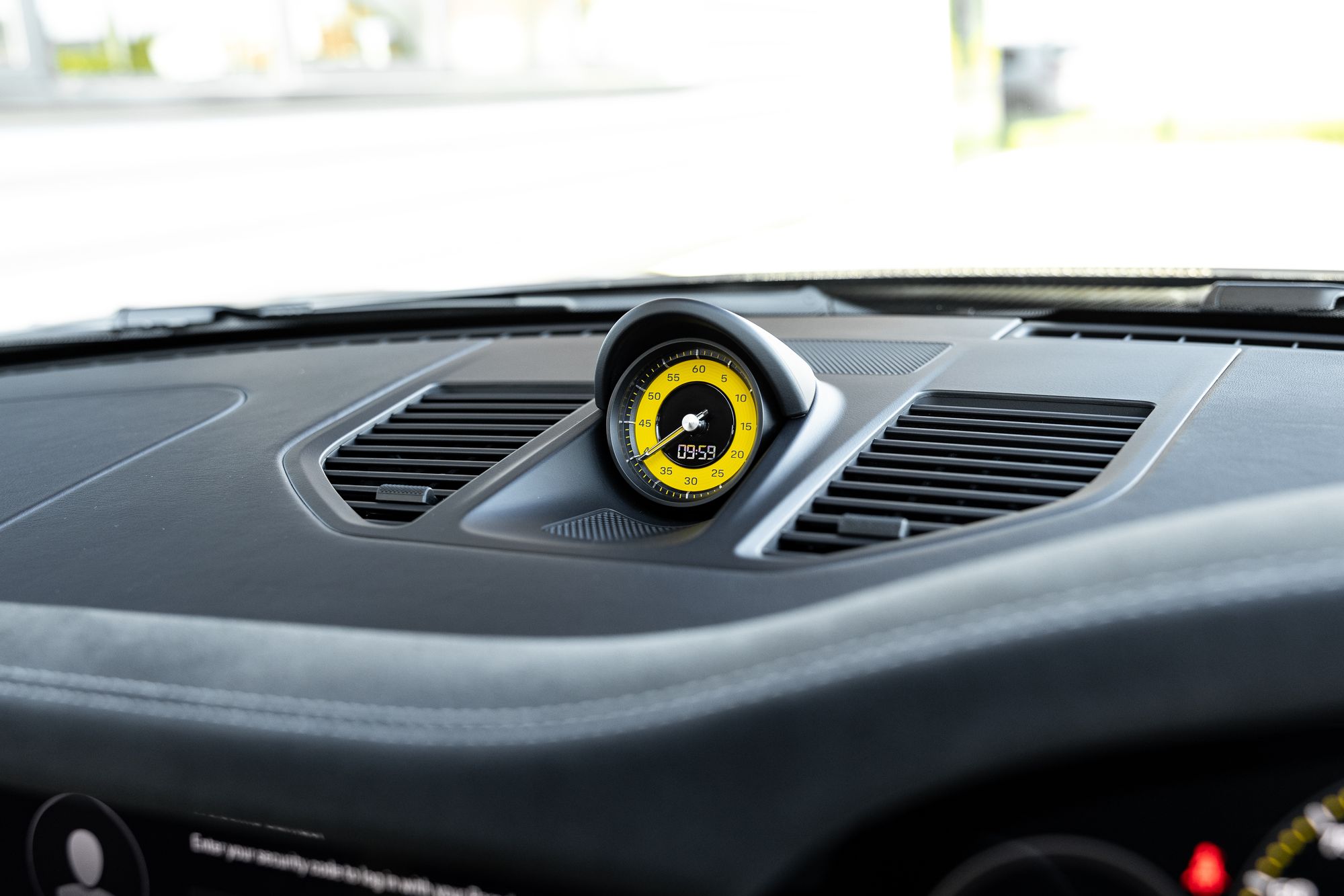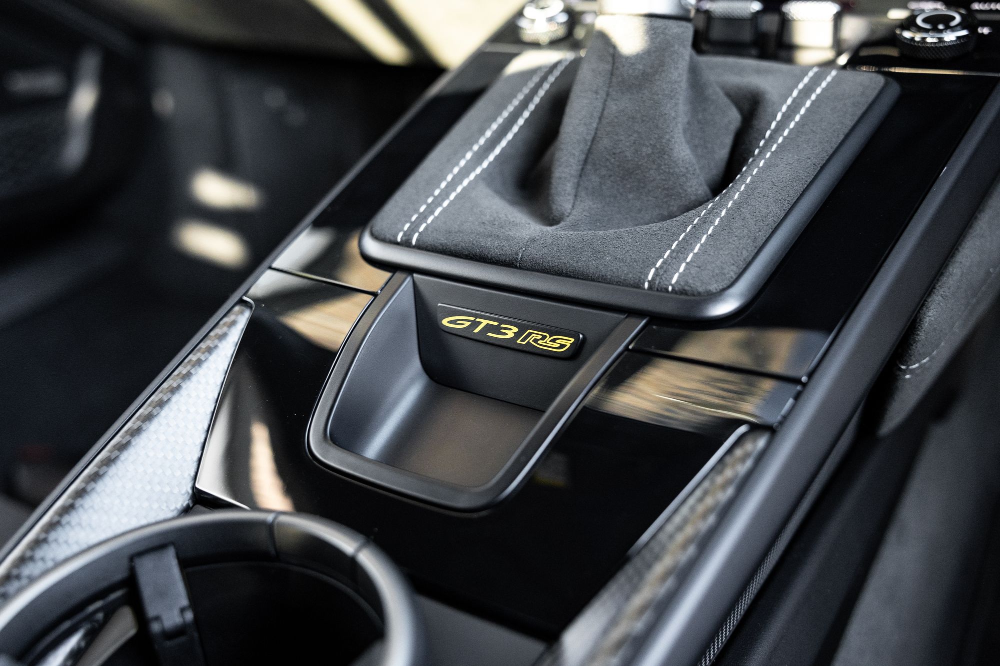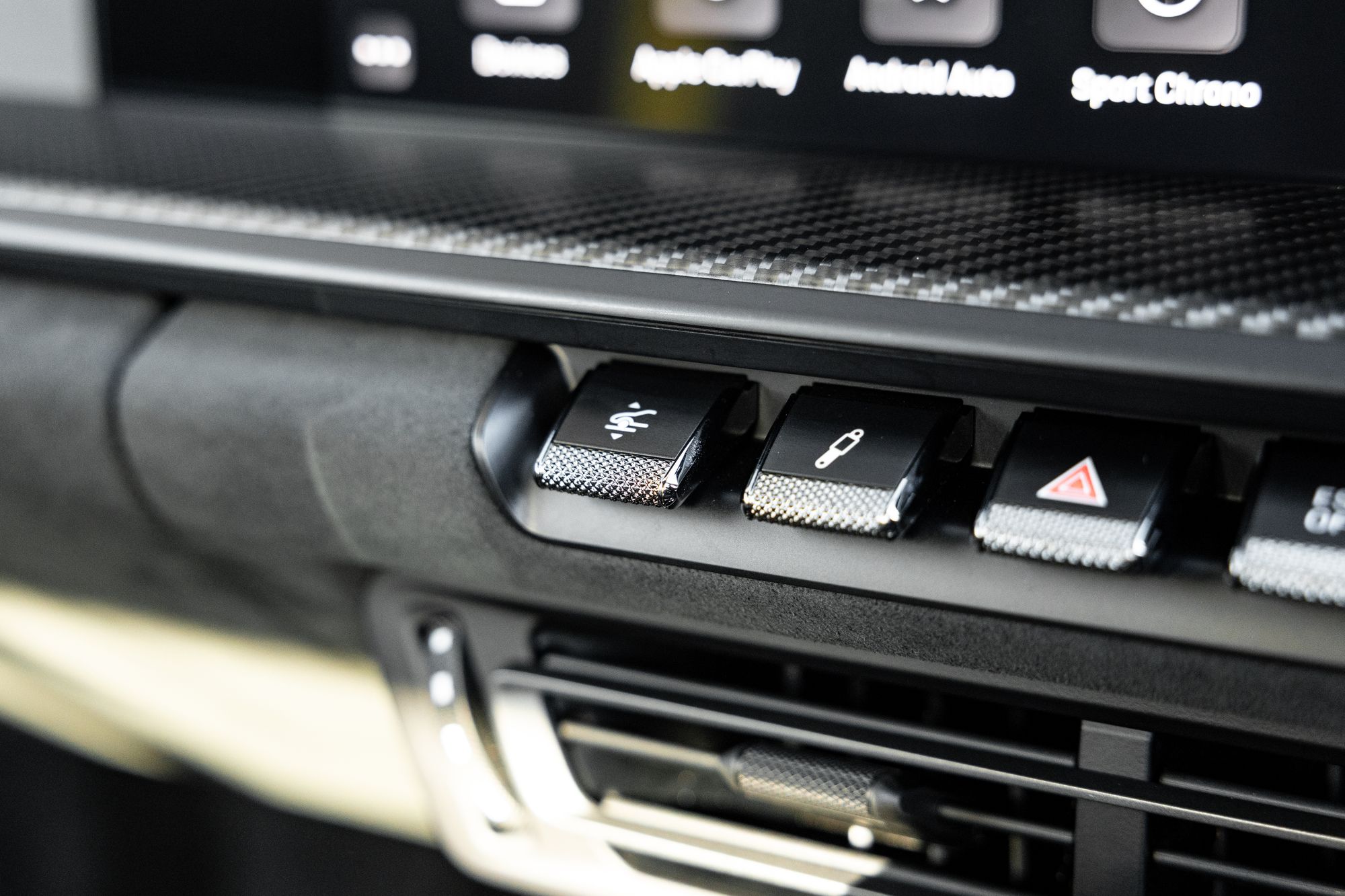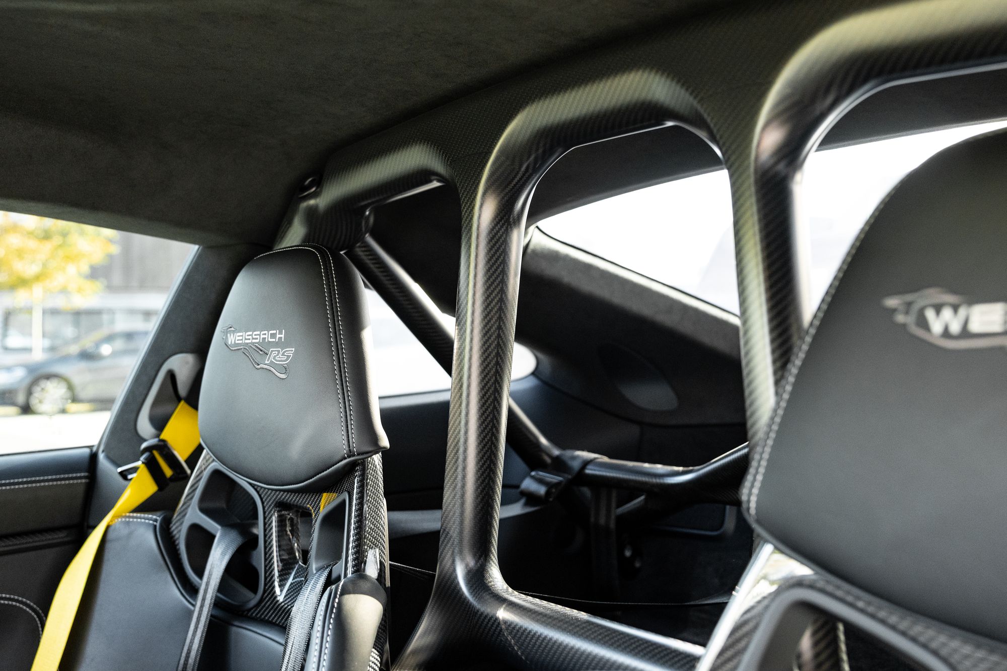 Inside, satin carbon-weave finish is also used on the steering wheel trim and door handles. The top of the dashboard is trimmed in Race-Tex to reduce reflective glare, similar to the flocked dashboards found in thoroughbred racing cars. The shift paddles are made from magnesium, with magnetic haptic elements derived from the 911 GT3 Cup for a crisp feel. The Weissach Package logo adorns the bezel of the cupholder, and is also embroidered into the headrests.