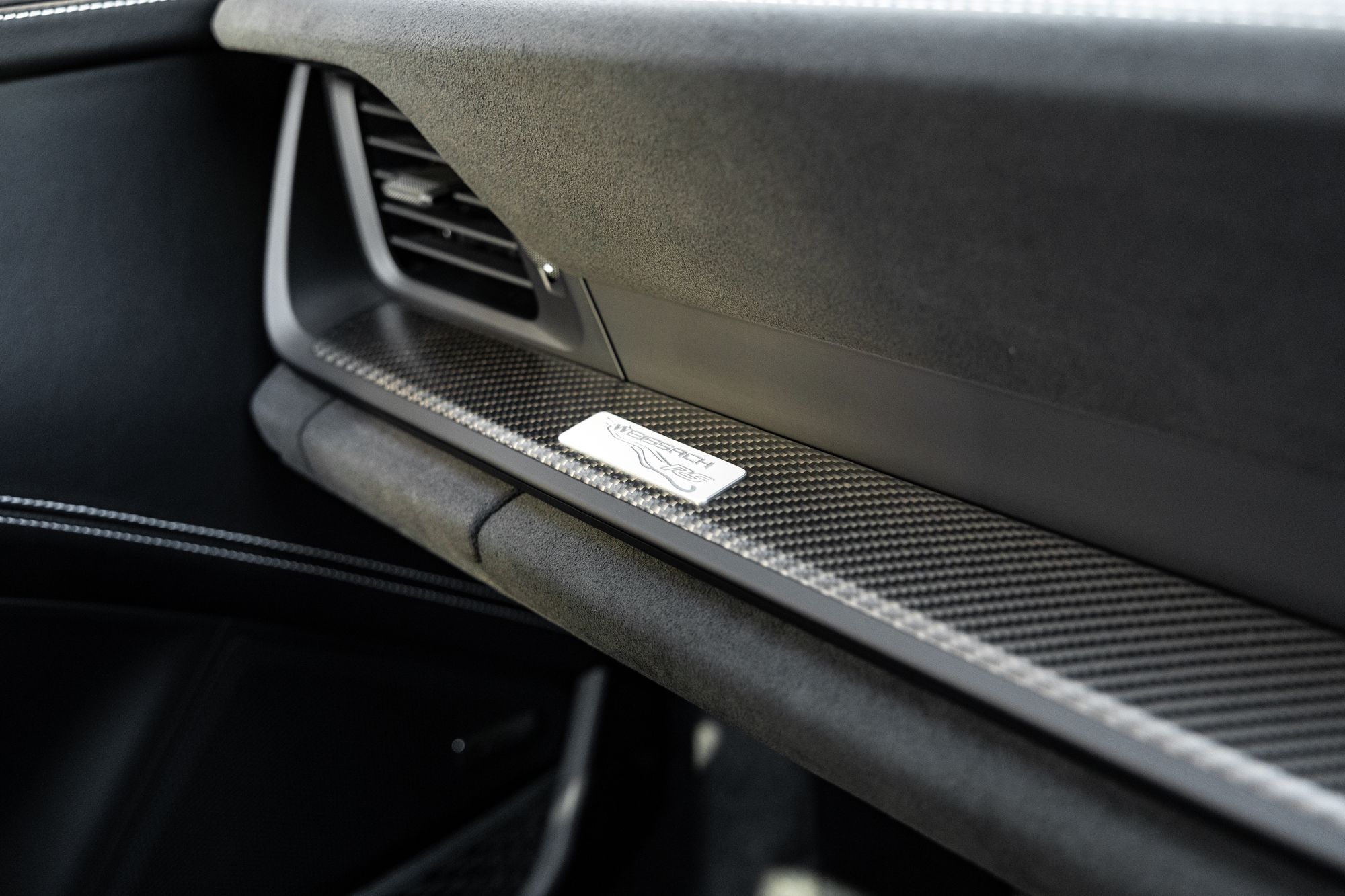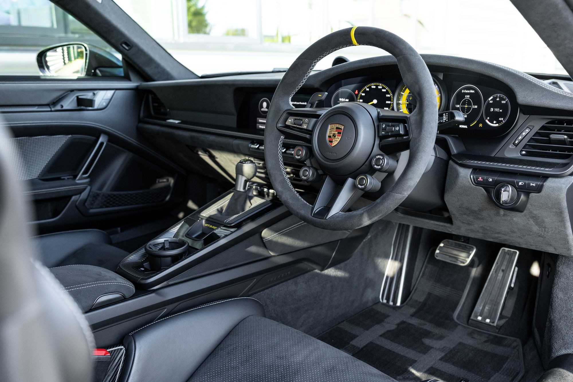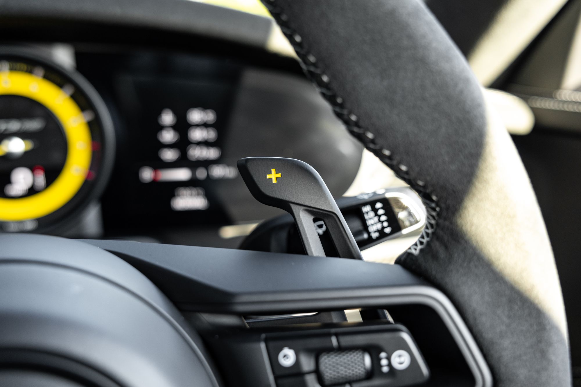Inside, satin carbon-weave finish is also used on the steering wheel trim and door handles. The top of the dashboard is trimmed in Race-Tex to reduce reflective glare, similar to the flocked dashboards found in thoroughbred racing cars. The shift paddles are made from magnesium, with magnetic haptic elements derived from the 911 GT3 Cup for a crisp feel. The Weissach Package logo adorns the bezel of the cupholder, and is also embroidered into the headrests.
