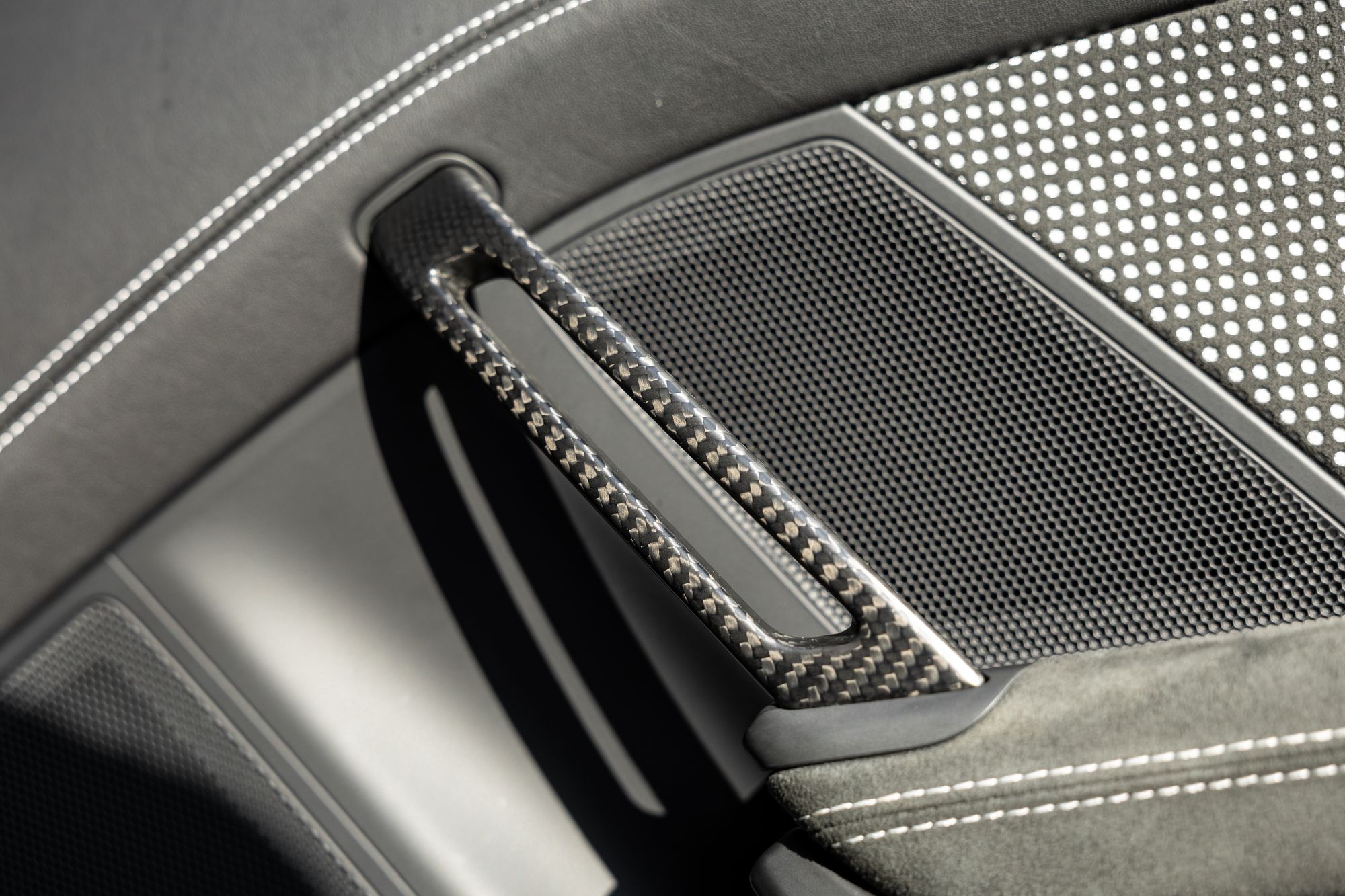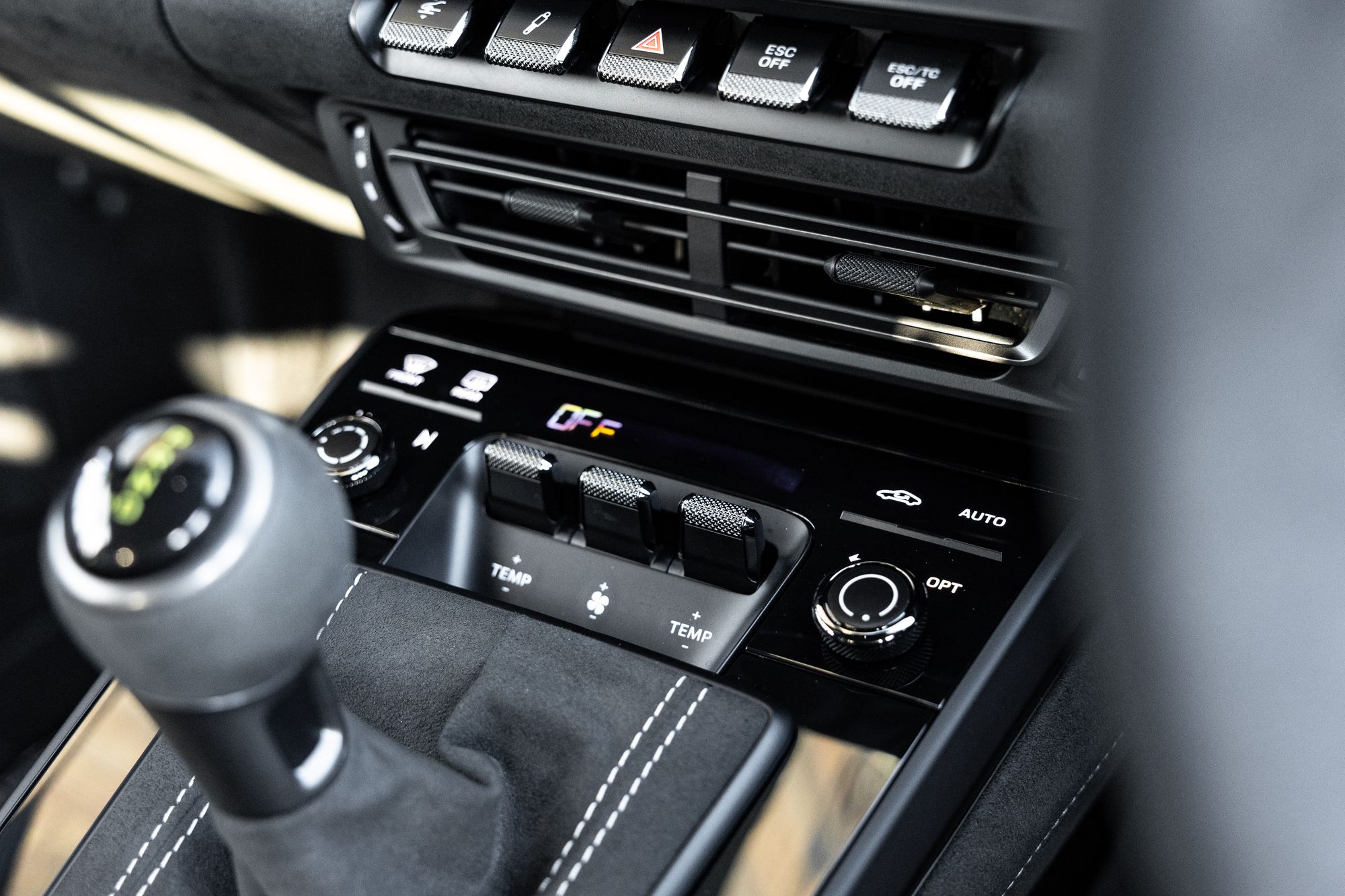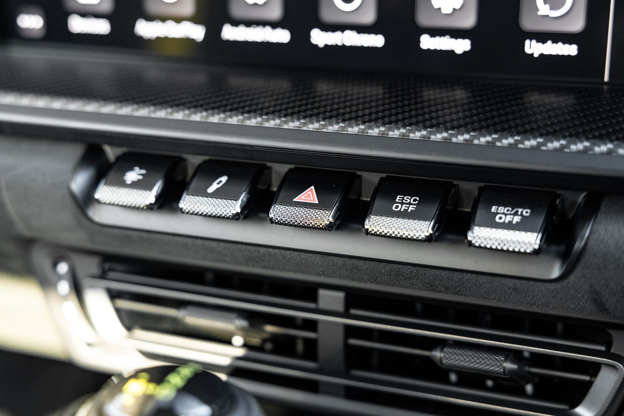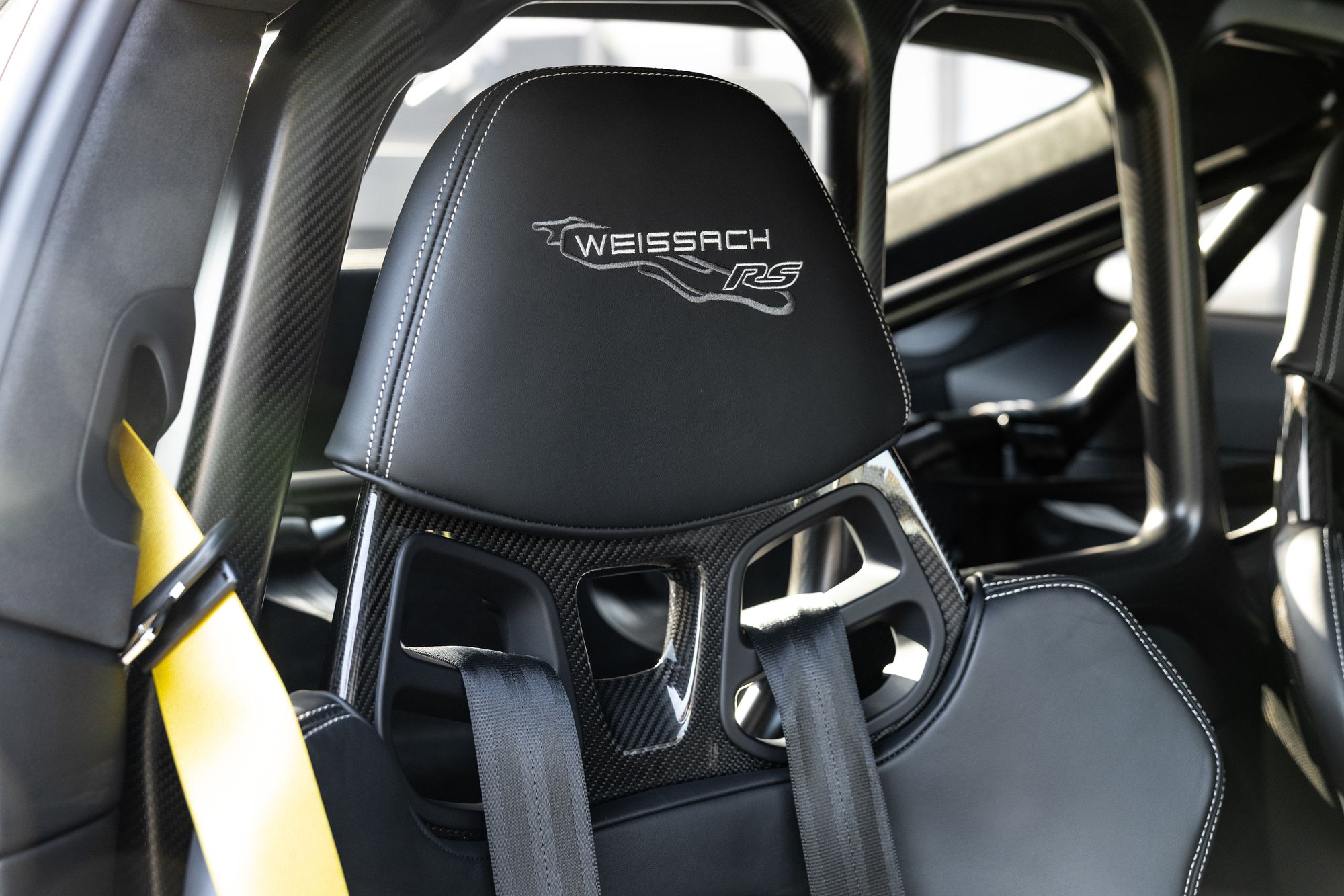 Inside, satin carbon-weave finish is also used on the steering wheel trim and door handles. The top of the dashboard is trimmed in Race-Tex to reduce reflective glare, similar to the flocked dashboards found in thoroughbred racing cars. The shift paddles are made from magnesium, with magnetic haptic elements derived from the 911 GT3 Cup for a crisp feel. The Weissach Package logo adorns the bezel of the cupholder, and is also embroidered into the headrests.