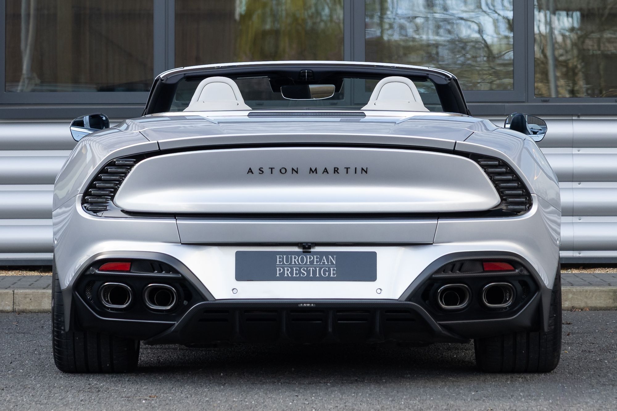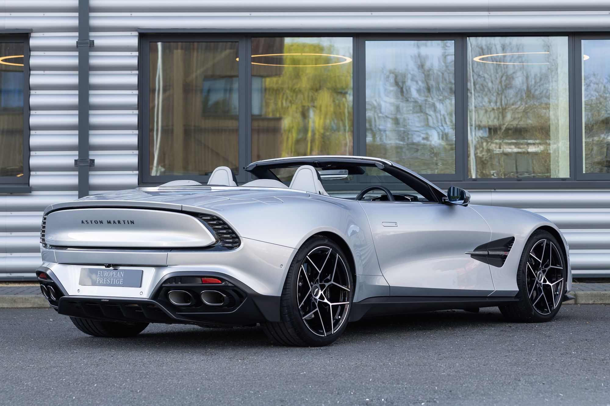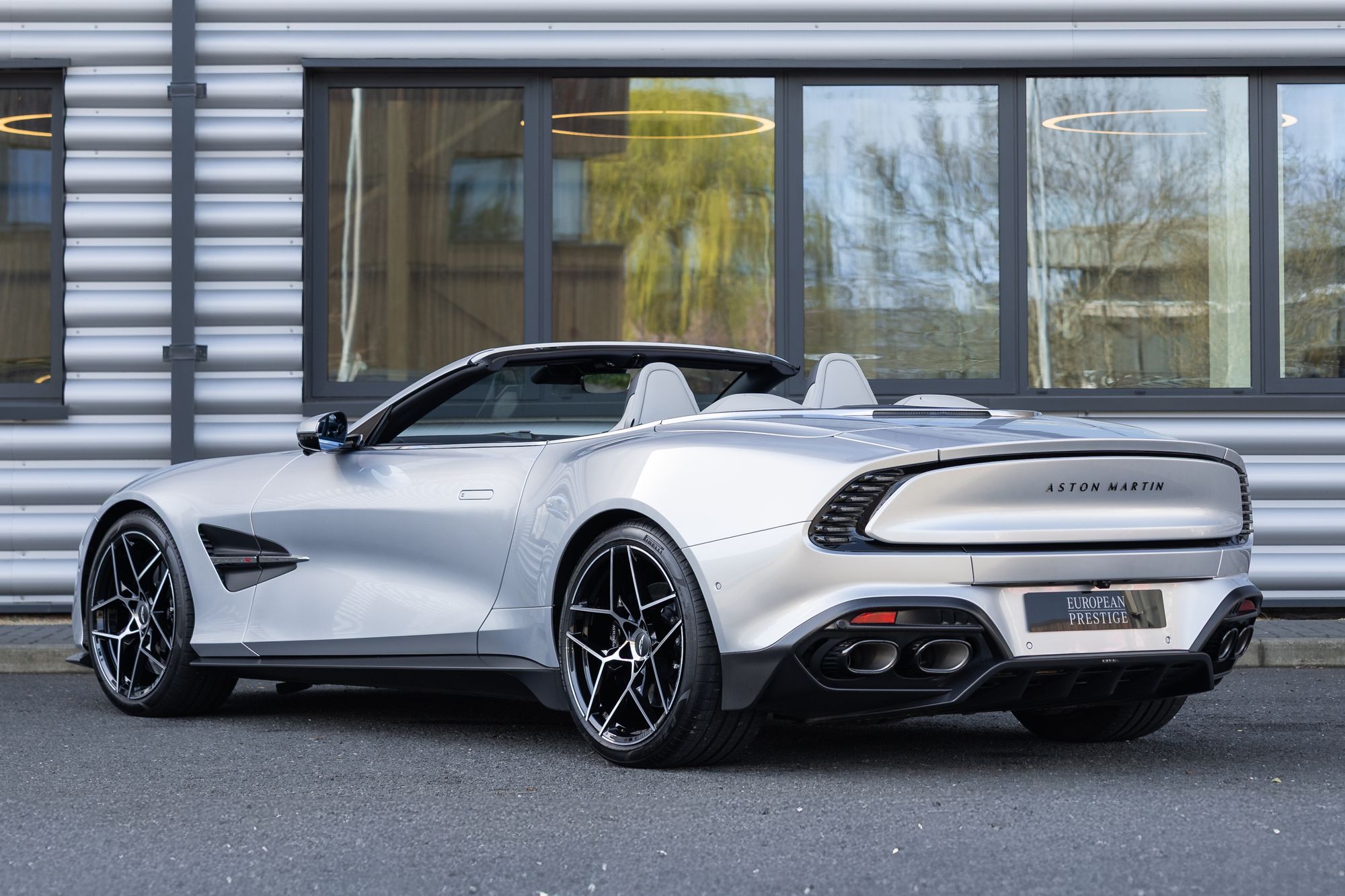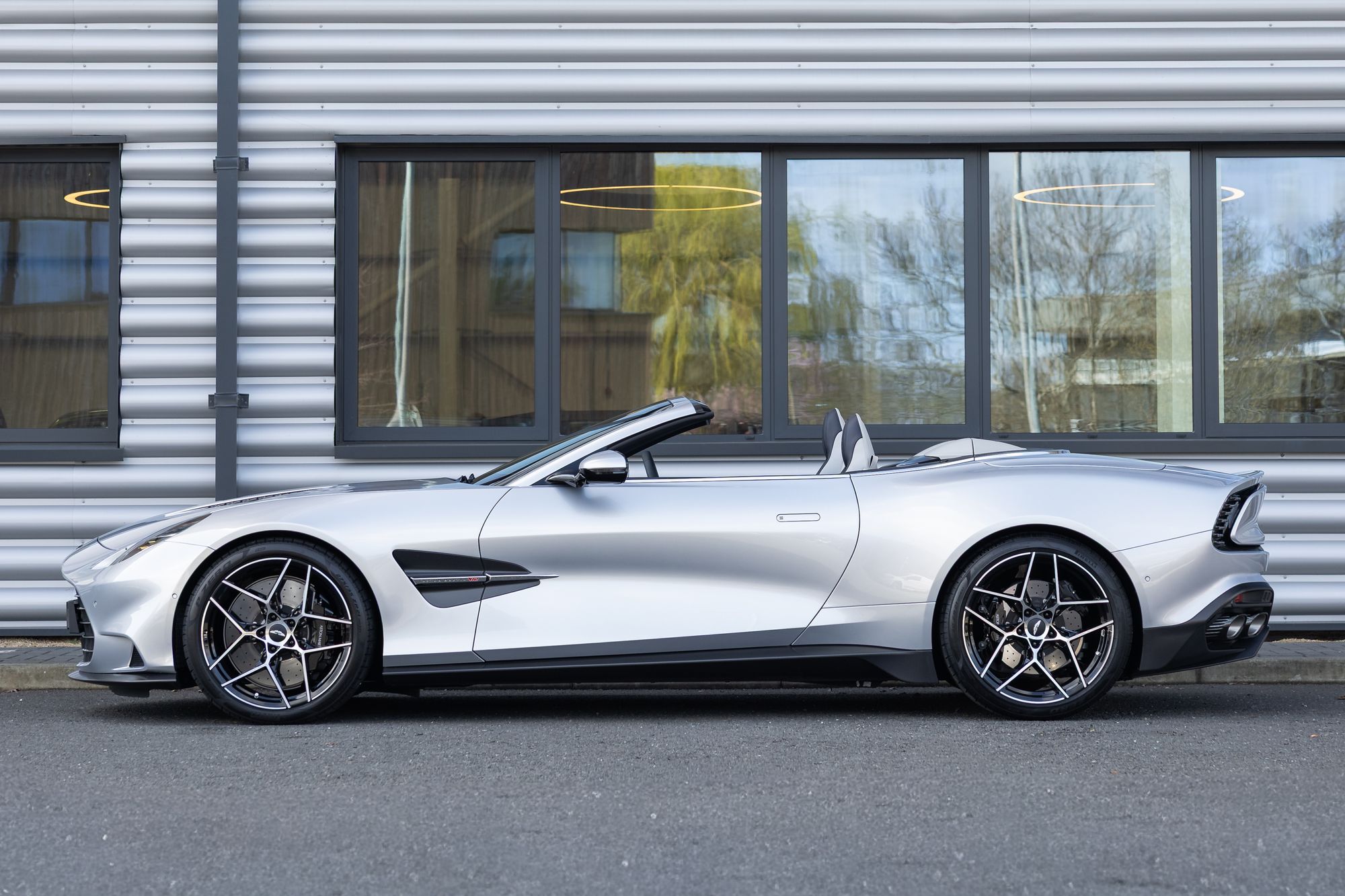 The Vanquish Volante is built on a bonded aluminium chassis with a wheelbase extended by 80mm compared with previous models, improving high-speed stability and ride quality. It also features advanced Bilstein DTX adaptive dampers, standard carbon-ceramic brakes, and sculpted carbon-fibre bodywork, including a wide front grille, muscular rear haunches, quad exhaust outlets, and a distinctive Kamm-tail rear design with floating LED light blades.