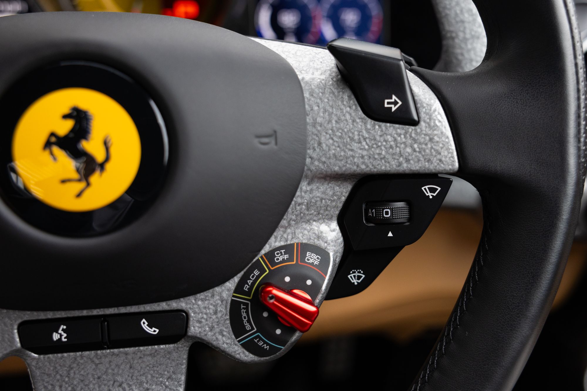 The interior of the 812 Superfast takes inspiration from both the preceding F12 Berlinetta and the interior of the LaFerrari. As part of the Ferrari's flagship model design, the centre control continues to lack a central infotainment display featured in entry-level models such as the GTC4Lusso and Portofino, retaining only a small temperature display for the climate control system and splitting all vehicular status information displays among the driver's multifunction instrument cluster, as well as the passenger-side touchscreen display.