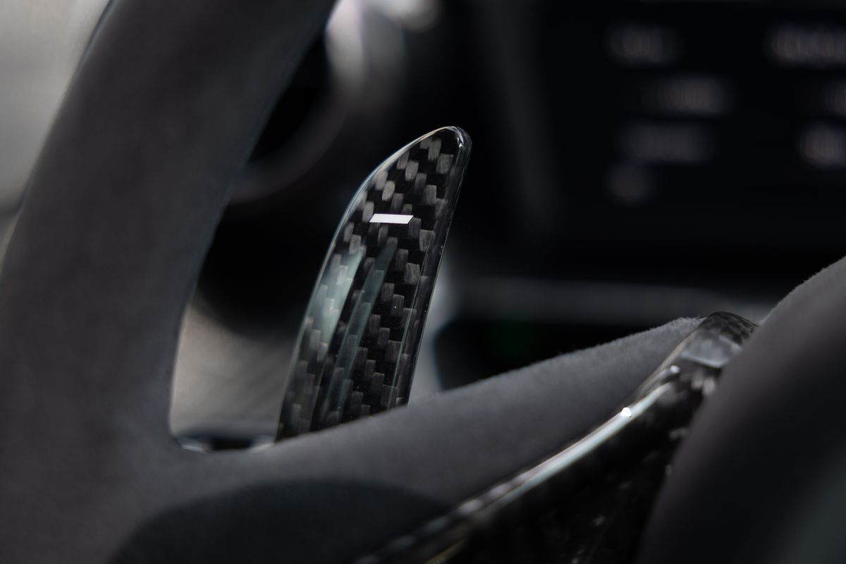 Inside, the cabin consists largely of exposed carbon fibre and Alcantara, and behind the two seats is room large enough for two helmets and race suits, reflecting the car's track-focused design.