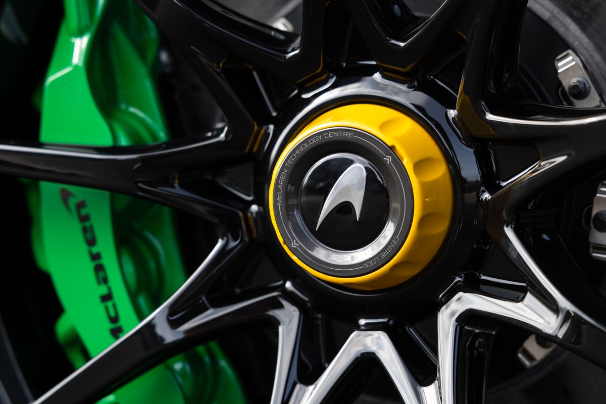 Aerodynamic features include a large electrically adjustable rear wing which doubles as an air brake, along with a double-element diffuser, a Formula One-inspired roof scoop, front and side air intakes, rear air louvres, and large front fenders. Stopping power is from Brembo carbon ceramic brakes, housed within lightweight centre-lock alloy wheels designed for Pirelli P-Zero Trofeo R tyres. The car utilises a top-mounted inconel-titanium exhaust system with three outlet pipes, as well as McLaren's hydraulic RaceActive Chassis Control II (RCC II) suspension with double-wishbone control arms.