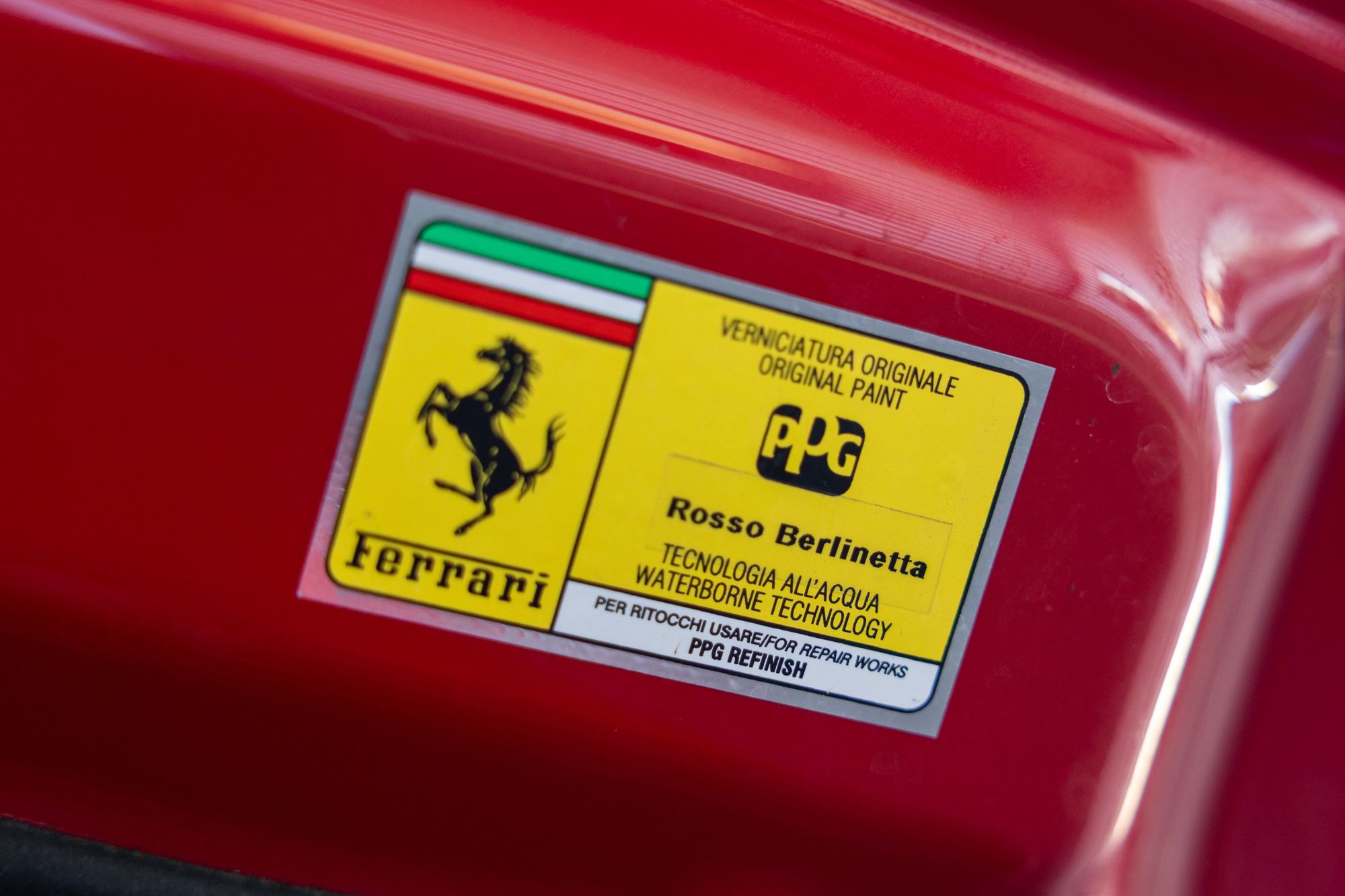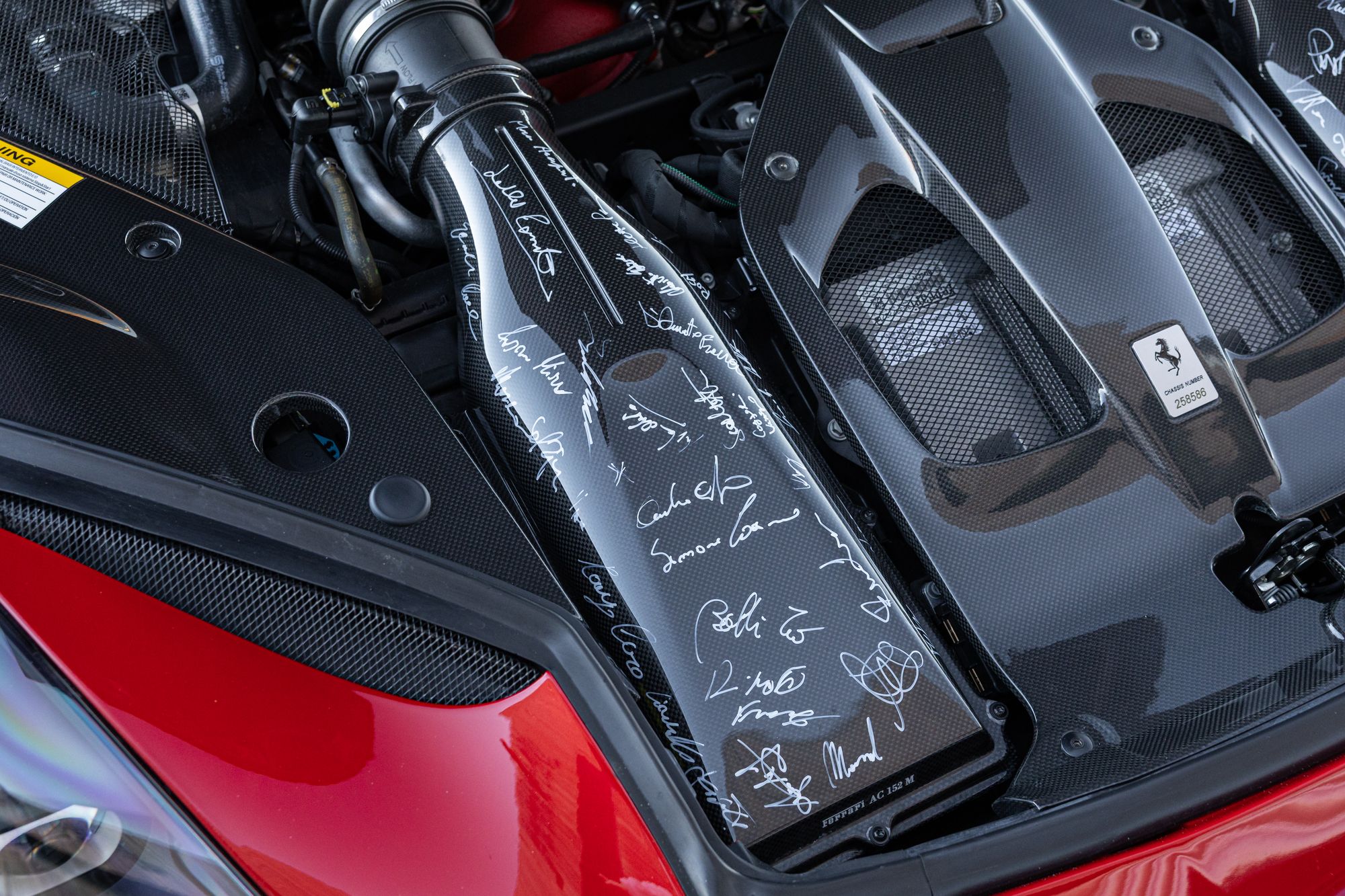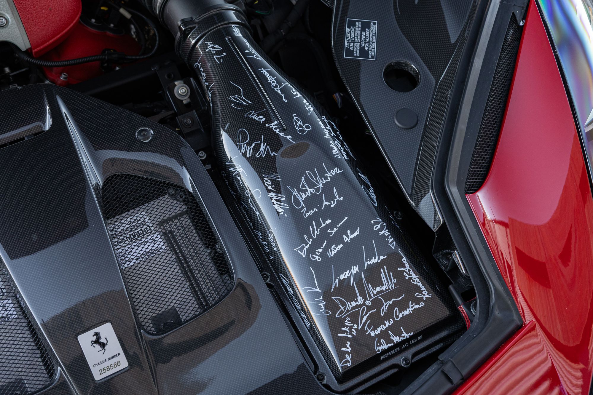 Key Points: Topaz Paint Protection Film (PPF) Applied To Whole Car, Production Team Signatures on Carbon Fibre Engine Filter Box, Rosso Berlinetta Exterior Paint.