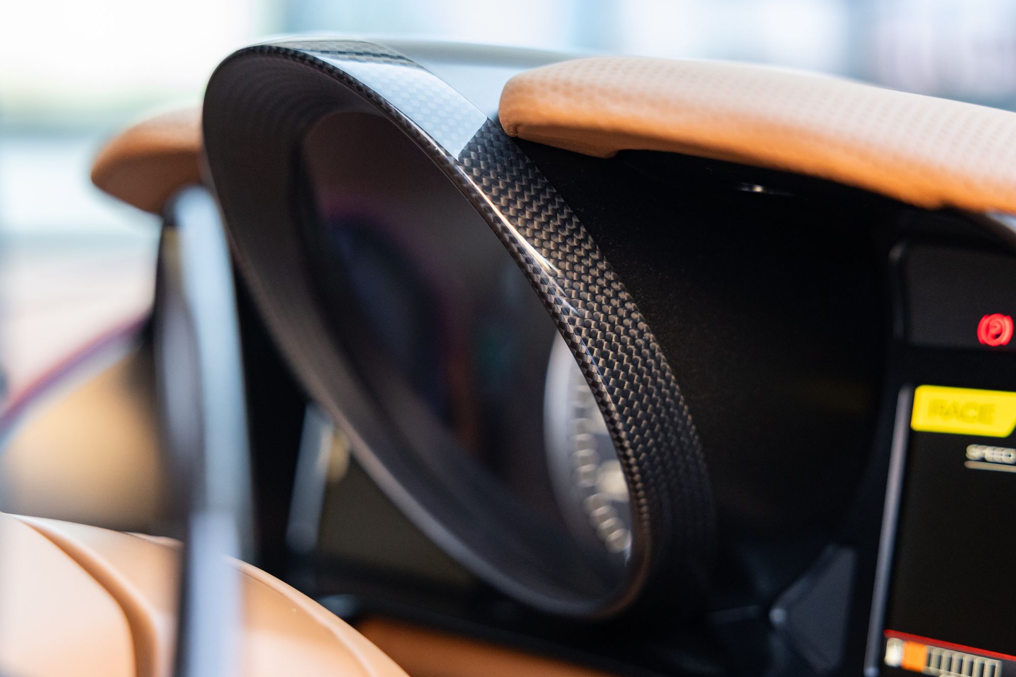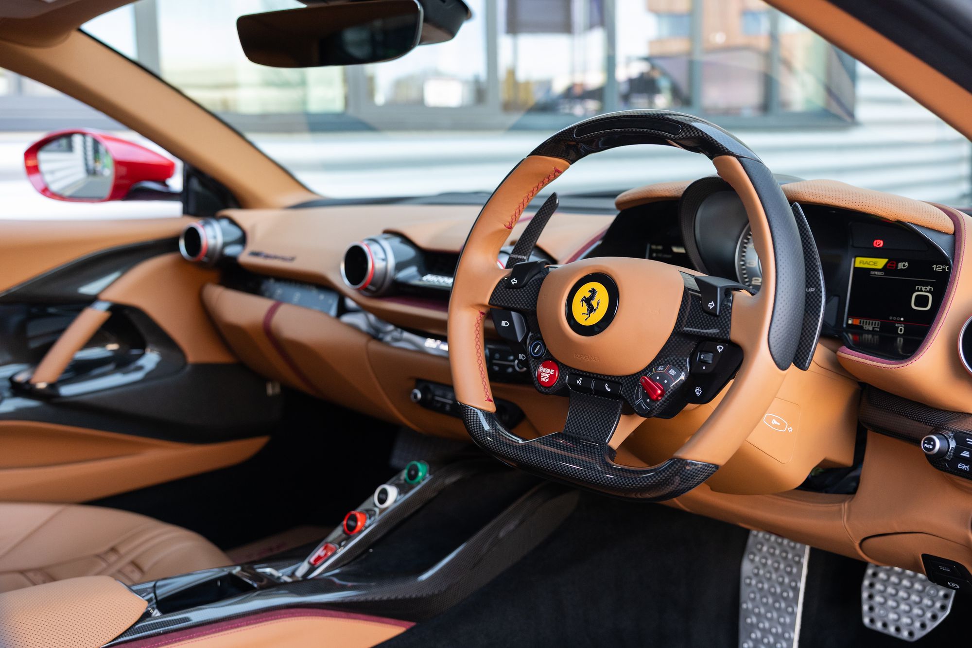 The interior of the 812 Superfast takes inspiration from both the preceding F12 Berlinetta and the interior of the LaFerrari. As part of the Ferrari's flagship model design, the centre control continues to lack a central infotainment display featured in entry-level models such as the GTC4Lusso and Portofino, retaining only a small temperature display for the climate control system and splitting all vehicular status information displays among the driver's multifunction instrument cluster, as well as the passenger-side touchscreen display.