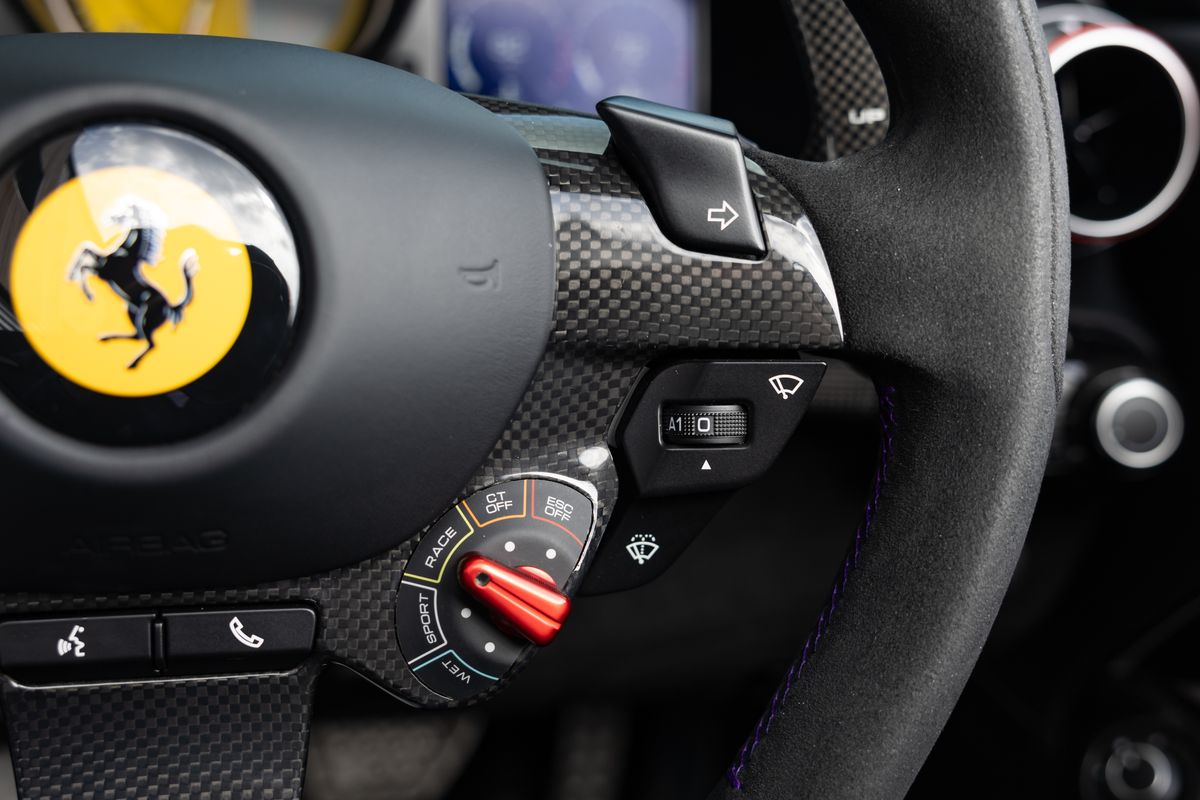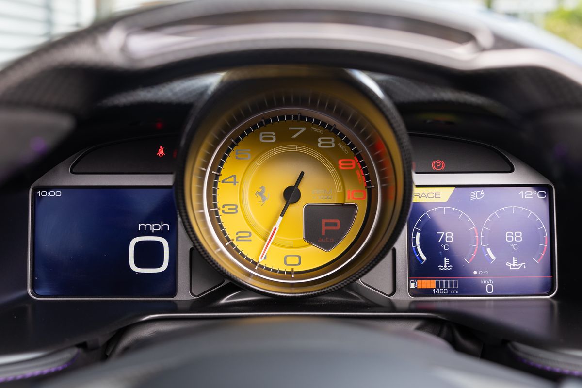 As seen in most Ferraris in recent years, the interior is relatively minimal and refined. There's not a large screen in the centre console like most cars nowadays; instead, the infotainment control is all held in the driver's display, so the driver never has to turn their head away from the road.