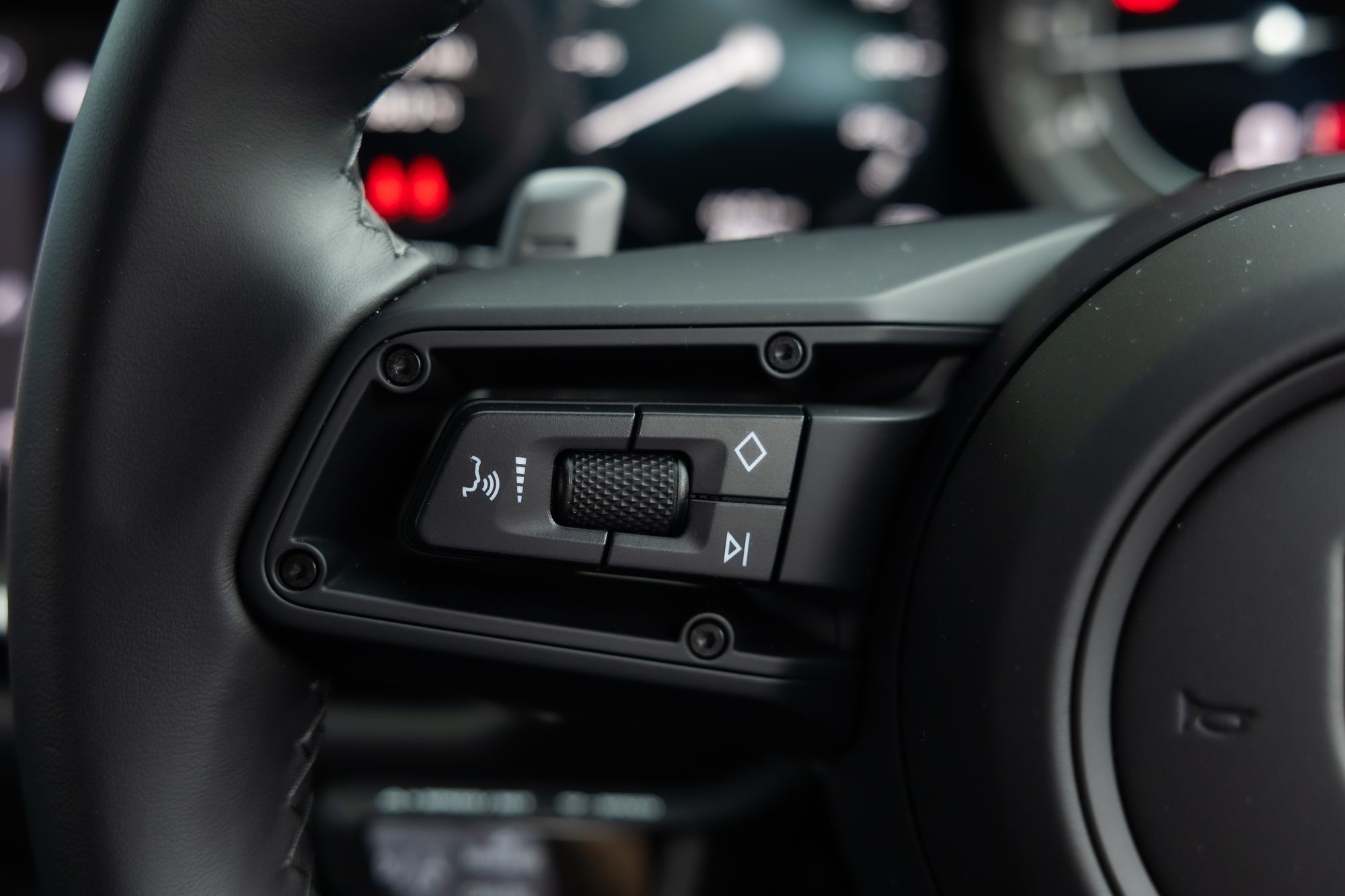 Standard equipment includes Porsche Dynamic Chassis Control (PDCC), rear-axle steering, ceramic composite brakes, active anti-roll bars, adaptive dampers, and 18-way electrically adjustable adaptive sports seats with the memory package.