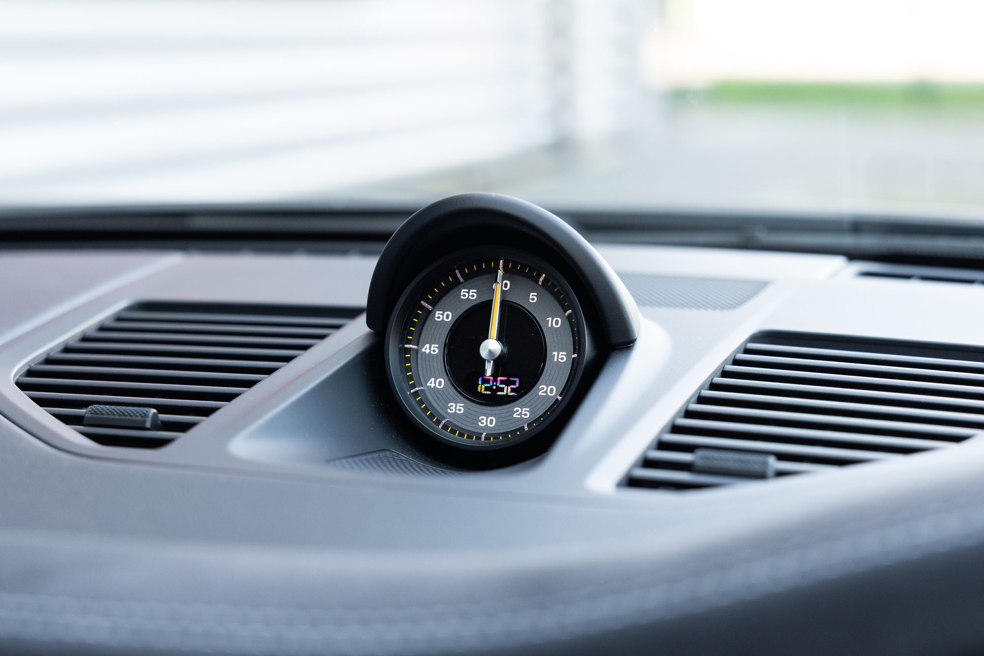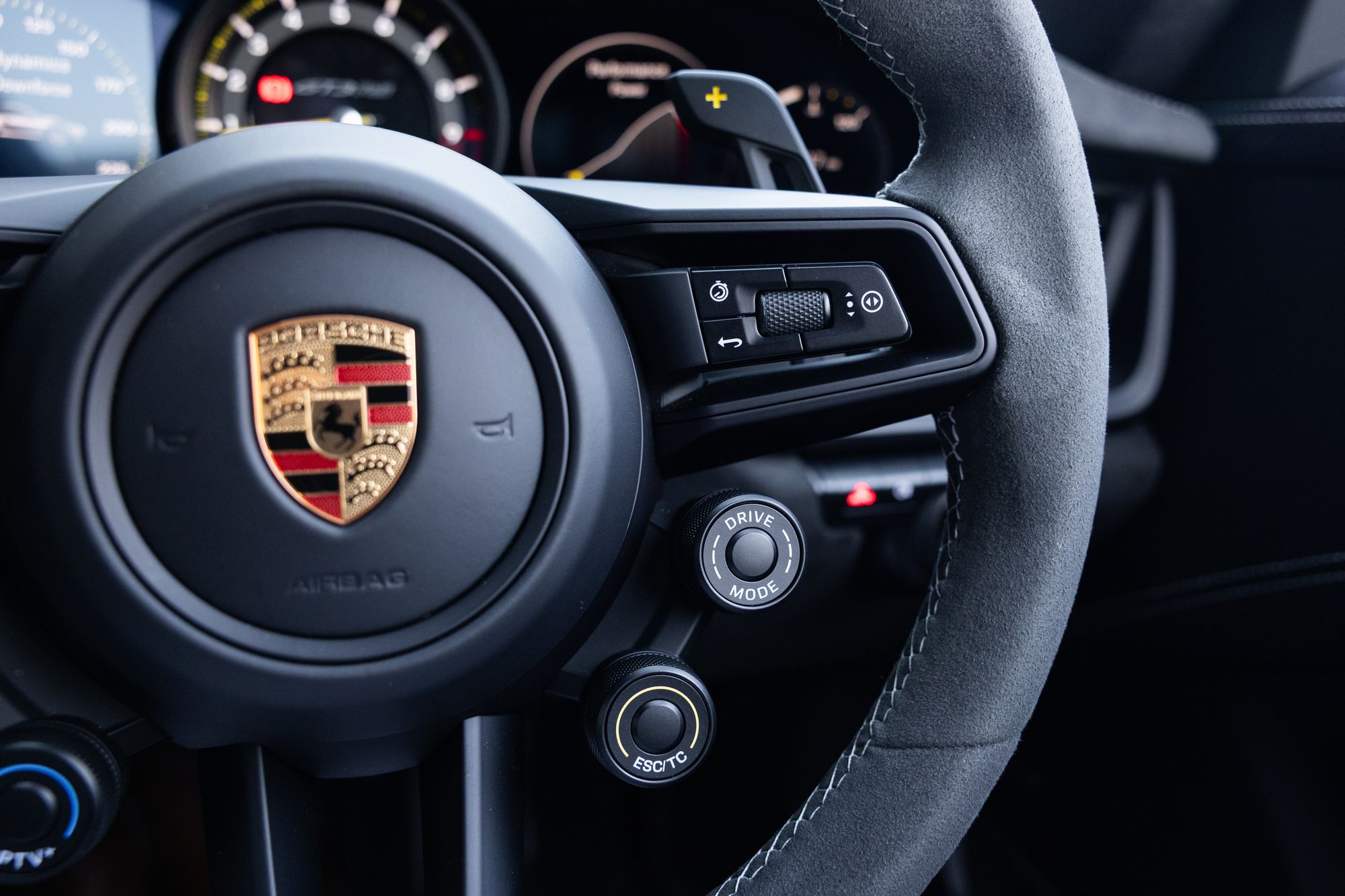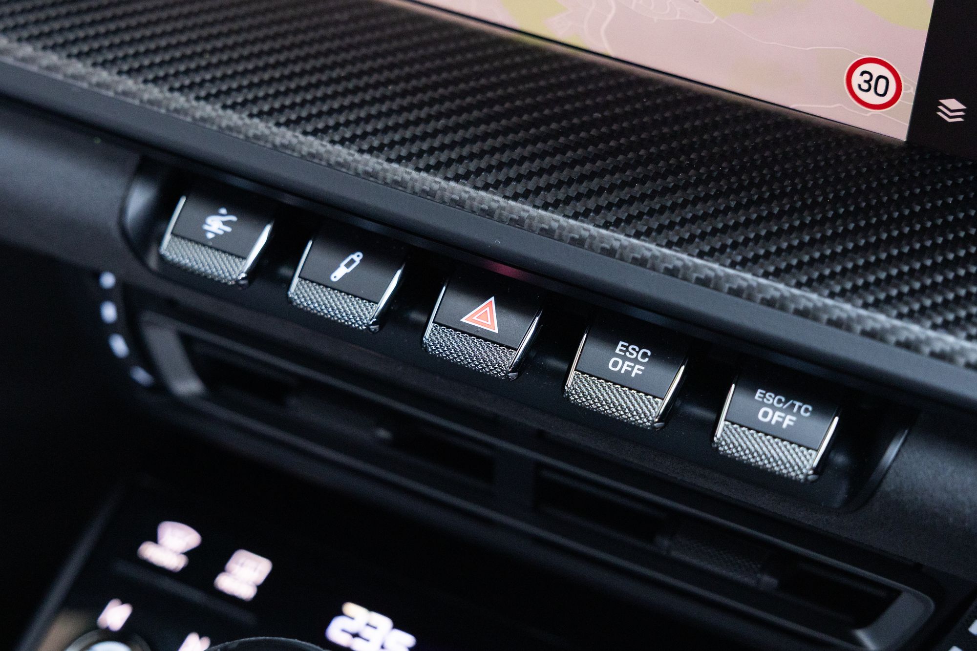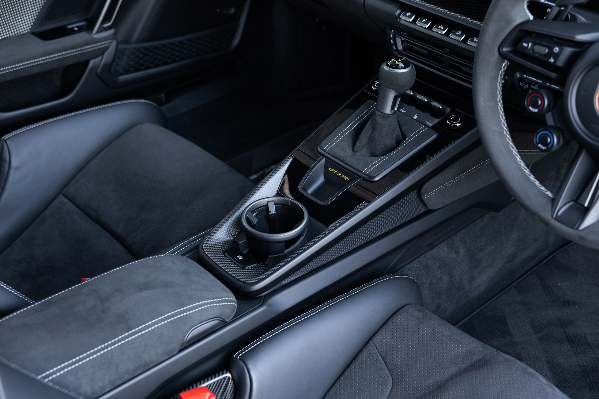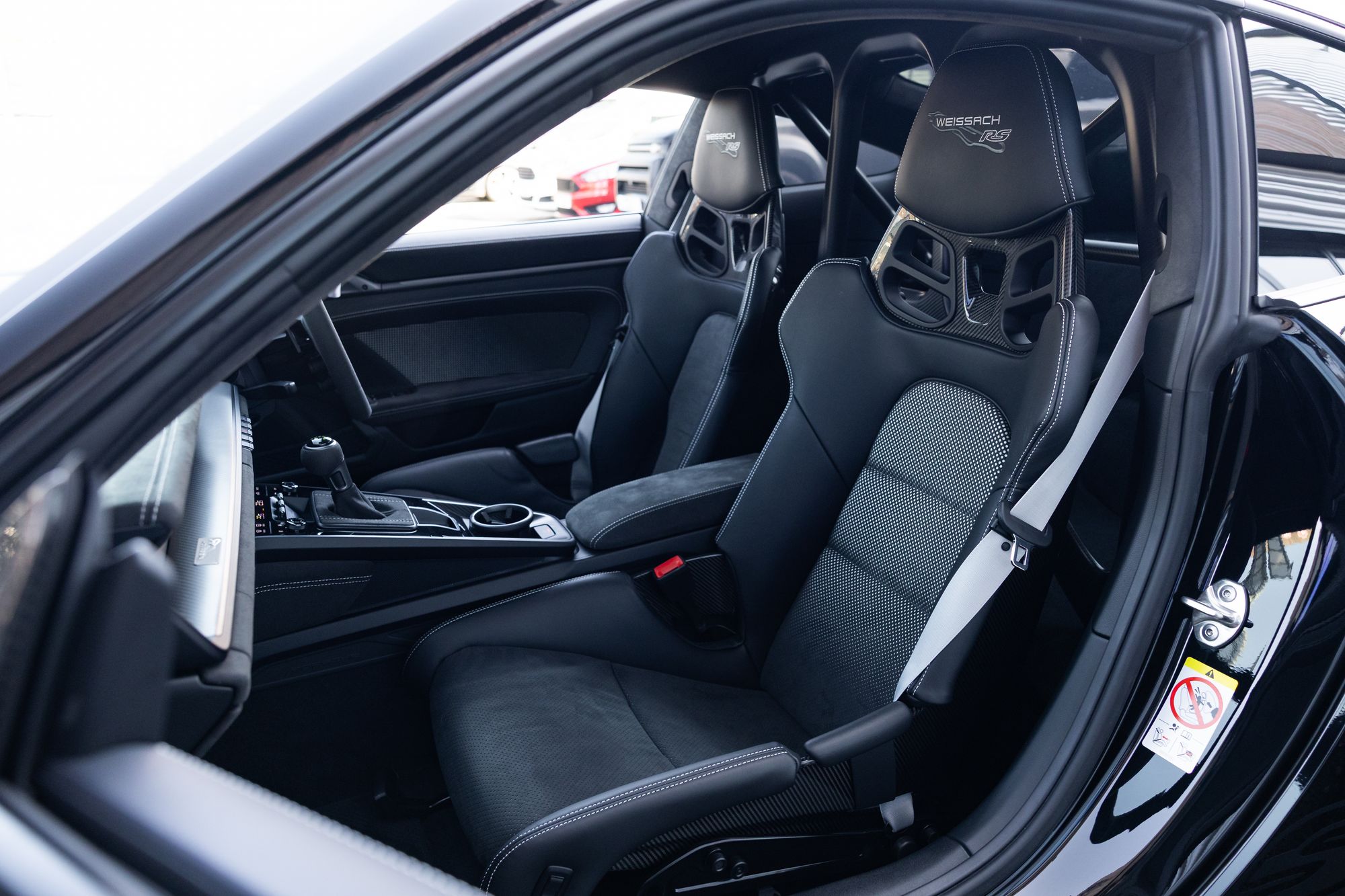 Inside, satin carbon-weave finish is also used on the steering wheel trim and door handles. The top of the dashboard is trimmed in Race-Tex to reduce reflective glare, similar to the flocked dashboards found in thoroughbred racing cars. The shift paddles are made from magnesium, with magnetic haptic elements derived from the 911 GT3 Cup for a crisp feel. The Weissach Package logo adorns the bezel of the cupholder, and is also embroidered into the headrests.