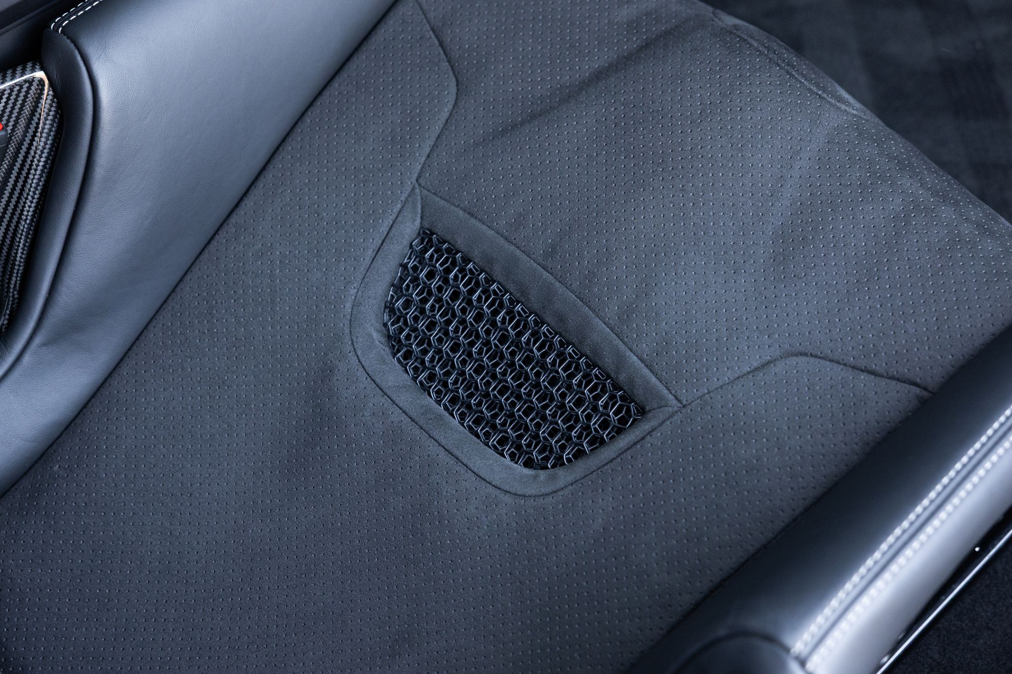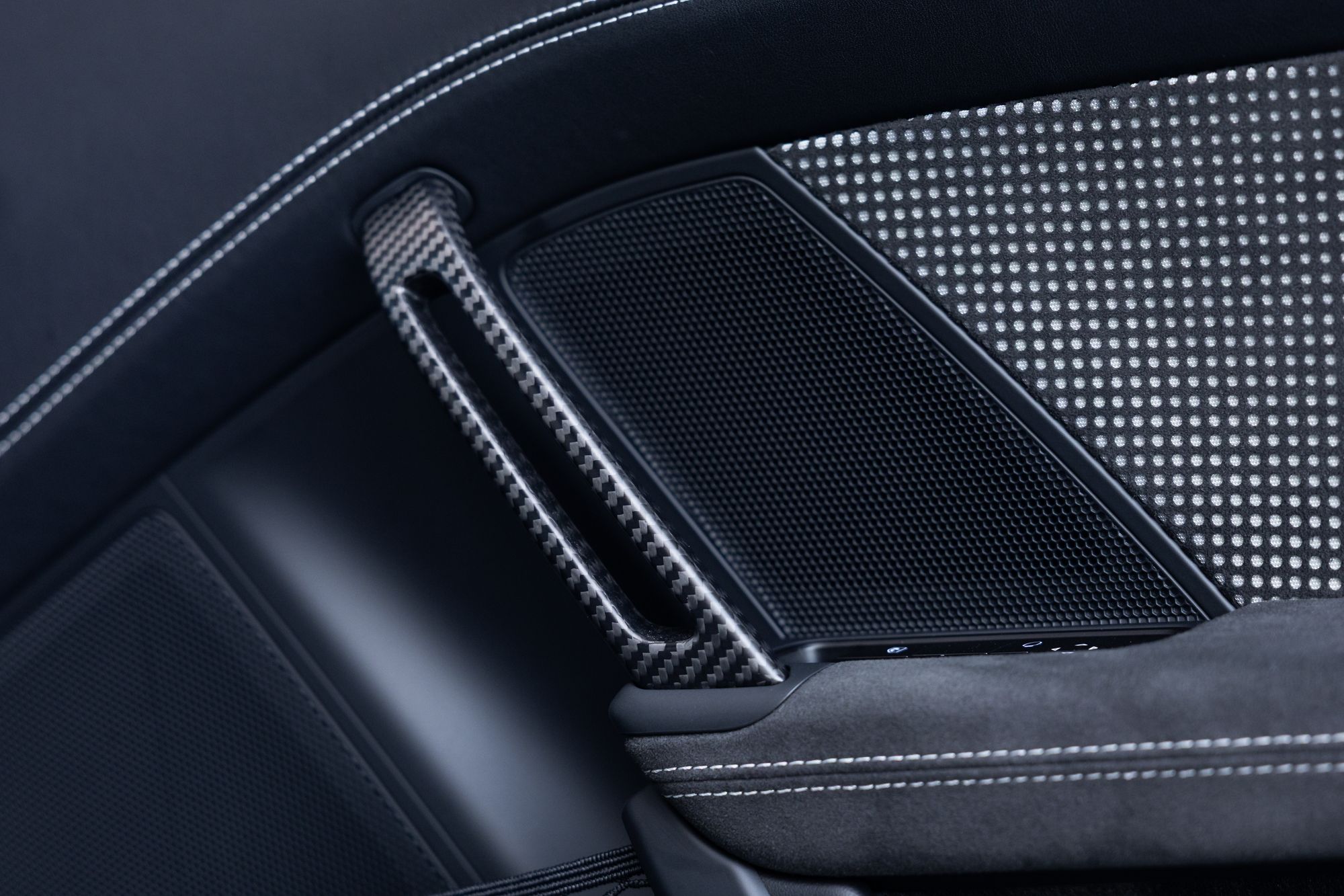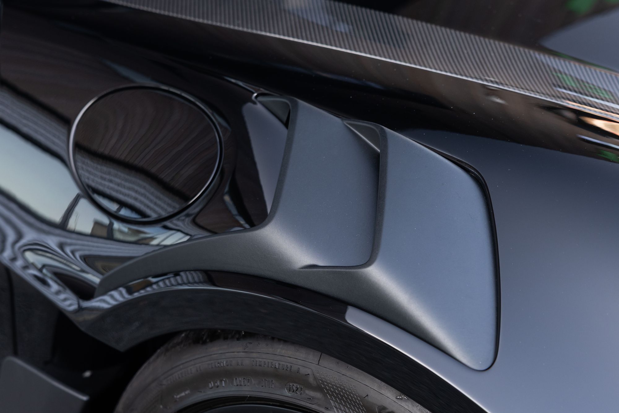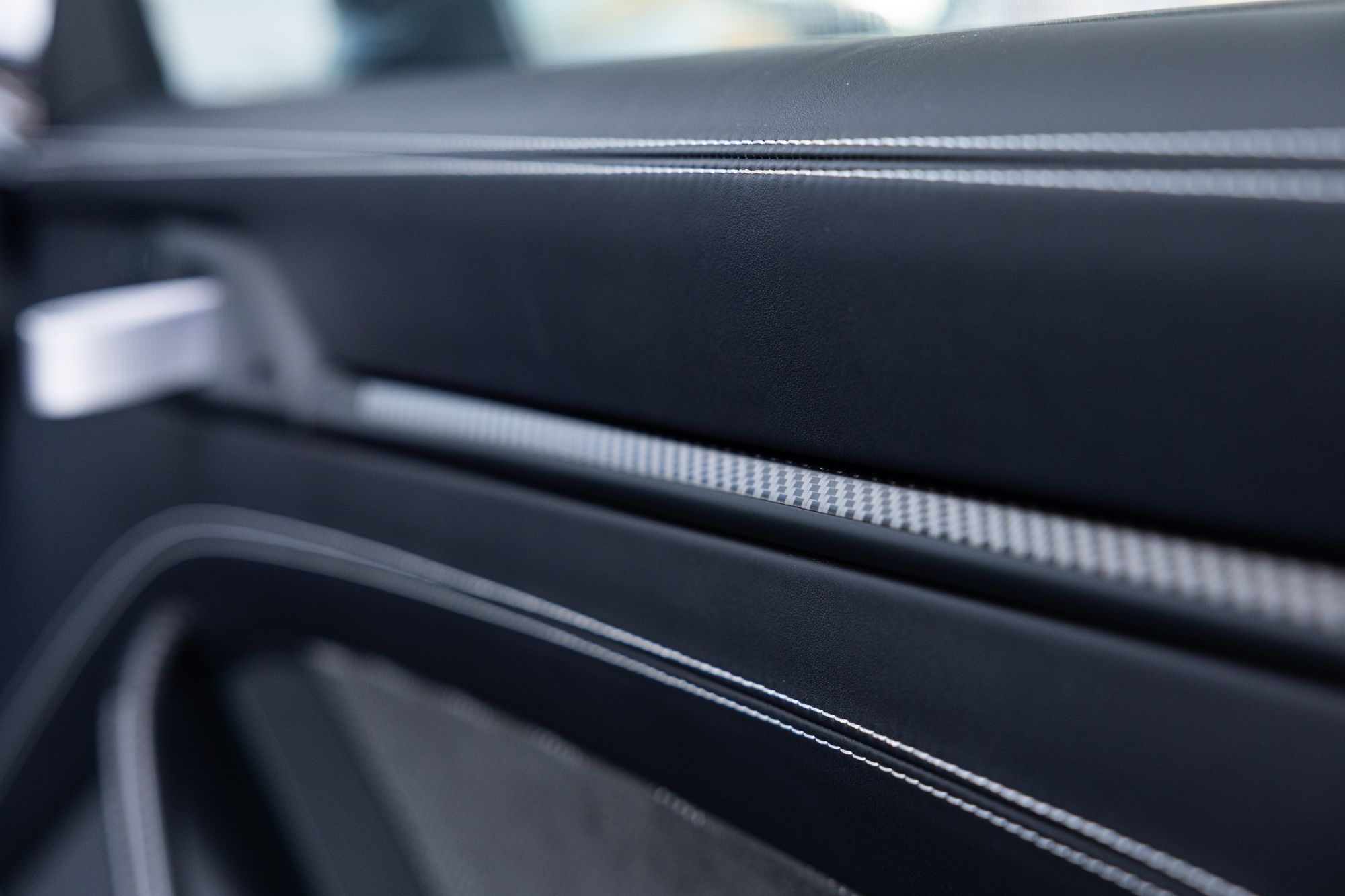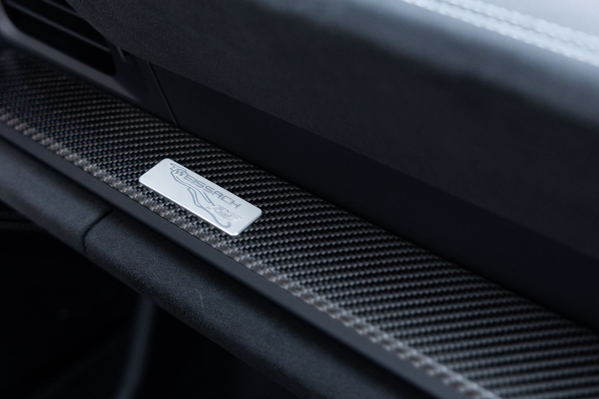 Inside, satin carbon-weave finish is also used on the steering wheel trim and door handles. The top of the dashboard is trimmed in Race-Tex to reduce reflective glare, similar to the flocked dashboards found in thoroughbred racing cars. The shift paddles are made from magnesium, with magnetic haptic elements derived from the 911 GT3 Cup for a crisp feel. The Weissach Package logo adorns the bezel of the cupholder, and is also embroidered into the headrests.