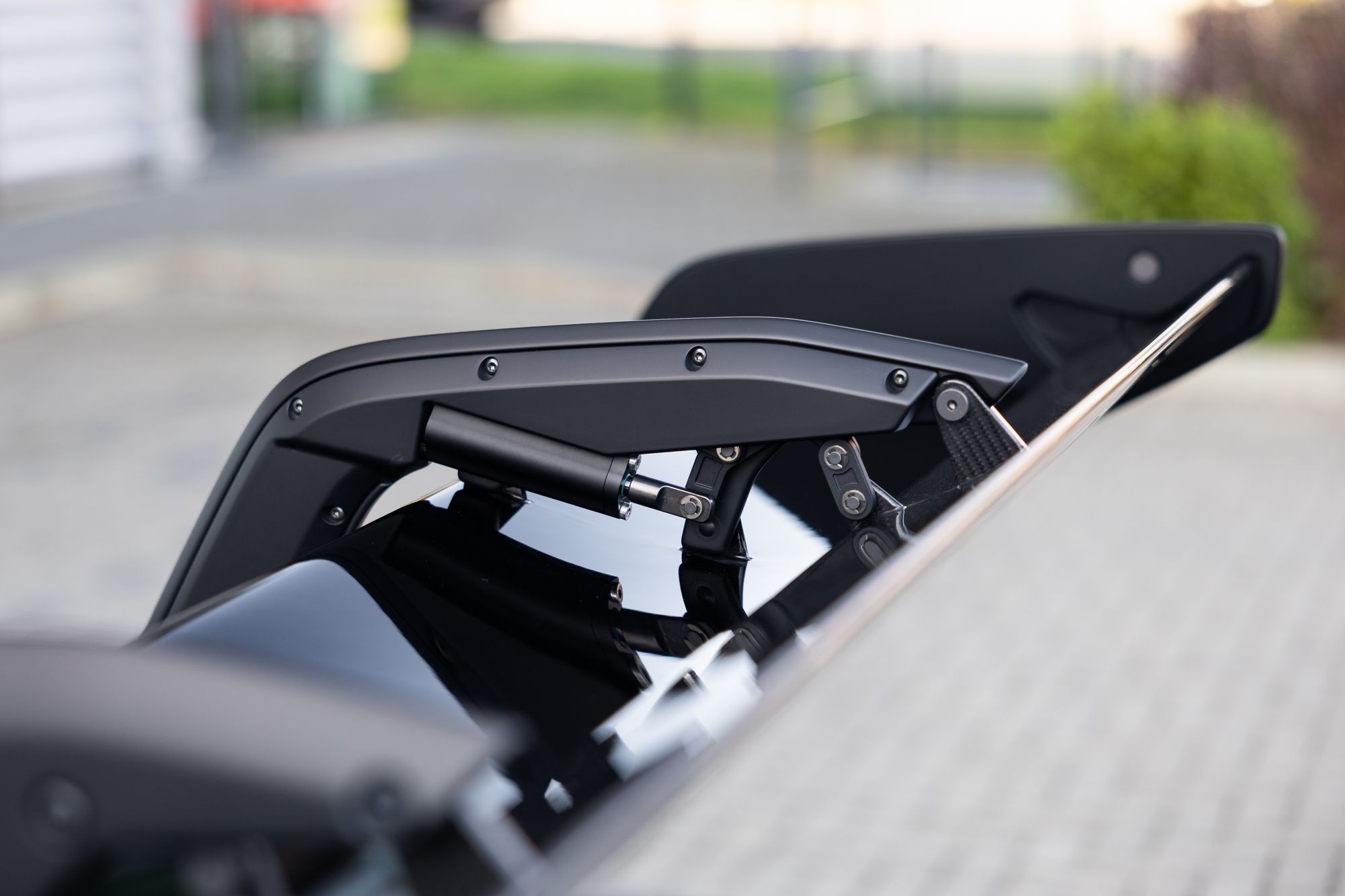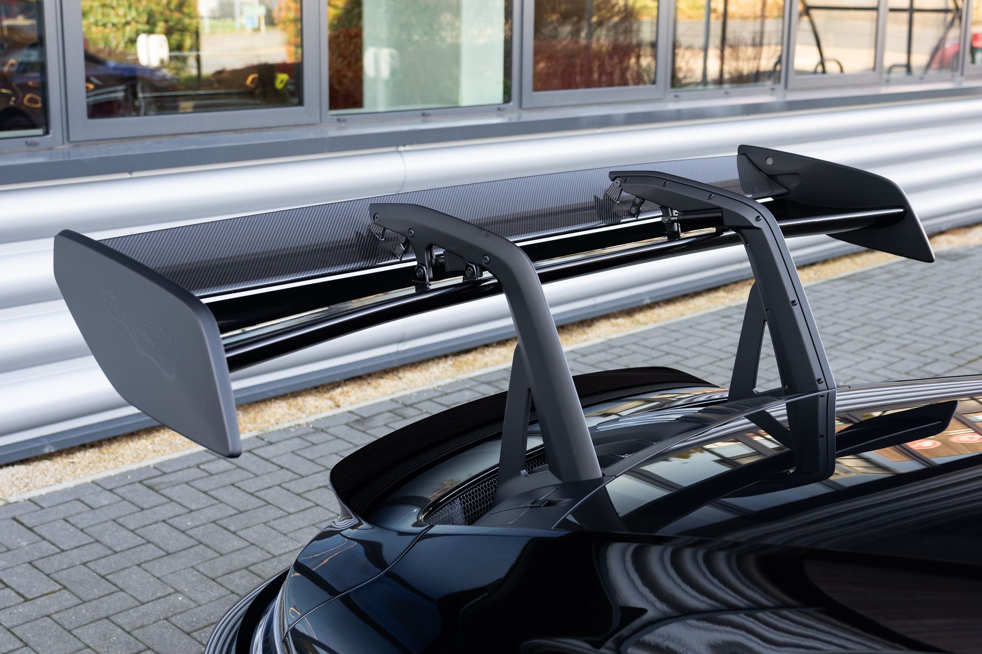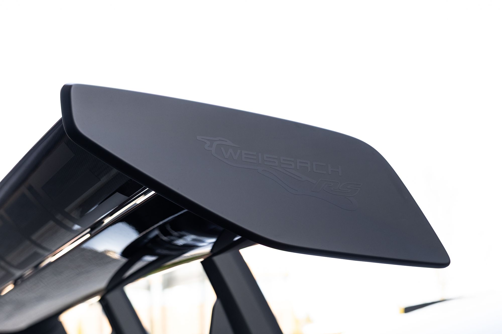 The Weissach Package reduces the weight further via the use of a carbon weave finish for the front lid, roof, mirror shells, and part of the large rear wing. Rear axle components such as the stabilisers, coupling rod and shear panel are also made of carbon, resulting in reduced unsprung mass and further improved handling. In conjunction with the Weissach package, lightweight magnesium forged wheels can be specified, which are more than 20% lighter than the standard aluminium wheels.