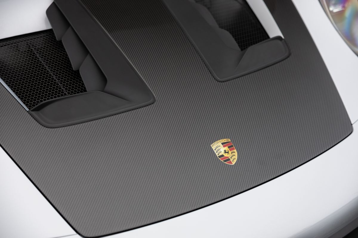 Inside, satin carbon-weave finish is also used on the steering wheel trim and door handles. The top of the dashboard is trimmed in Race-Tex to reduce reflective glare, similar to the flocked dashboards found in thoroughbred racing cars. The shift paddles are made from magnesium, with magnetic haptic elements derived from the 911 GT3 Cup for a crisp feel. The Weissach Package logo adorns the bezel of the cupholder, and is also embroidered into the headrests.